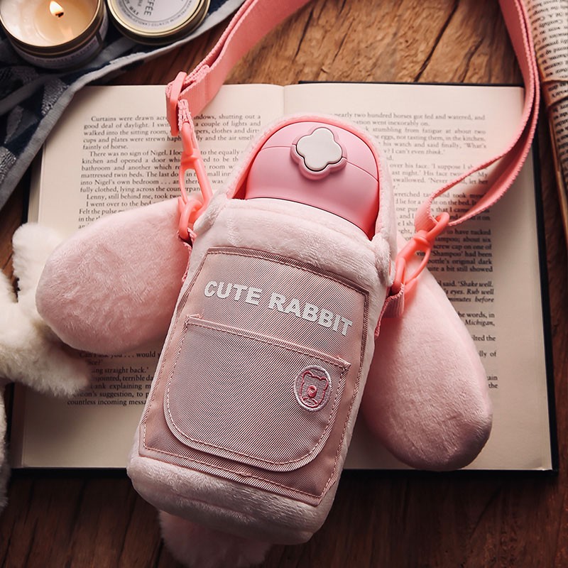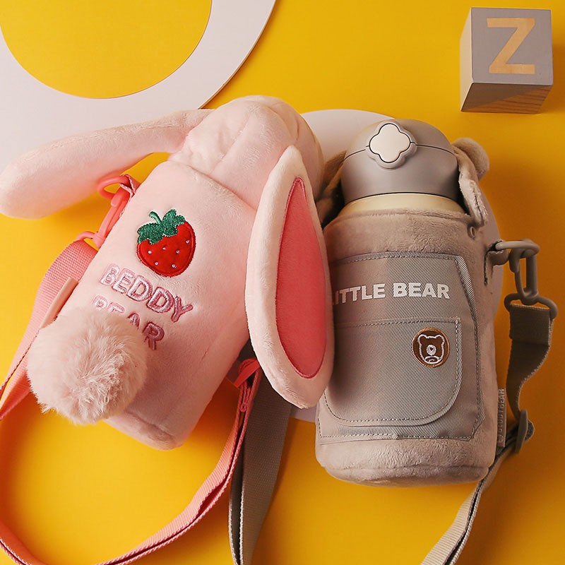 韩国杯具熊儿童保温杯可爱斜跨毛绒兔子吸管杯宝宝带杯套学生少女水杯