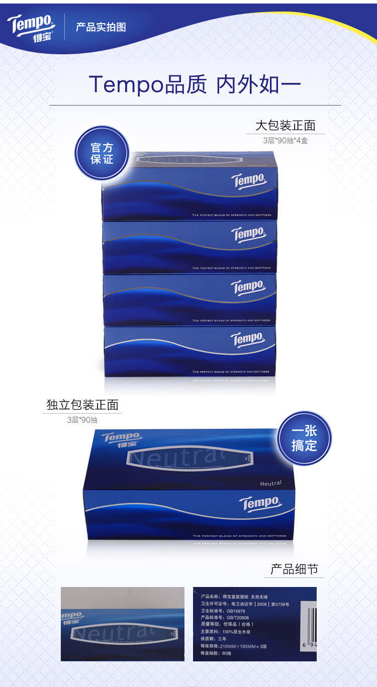 得宝T2274盒装抽纸3层90抽4盒*1提
