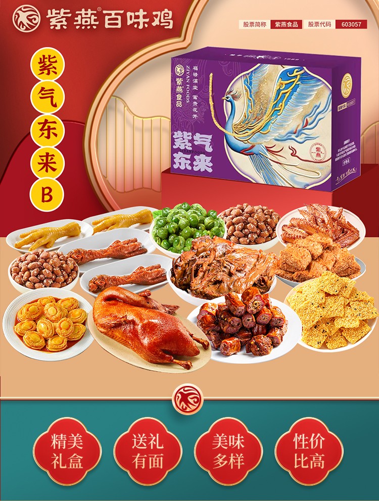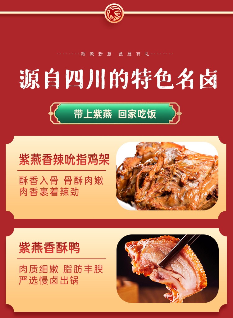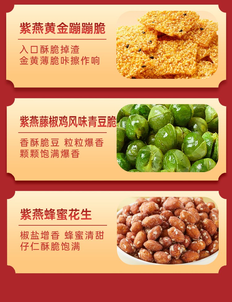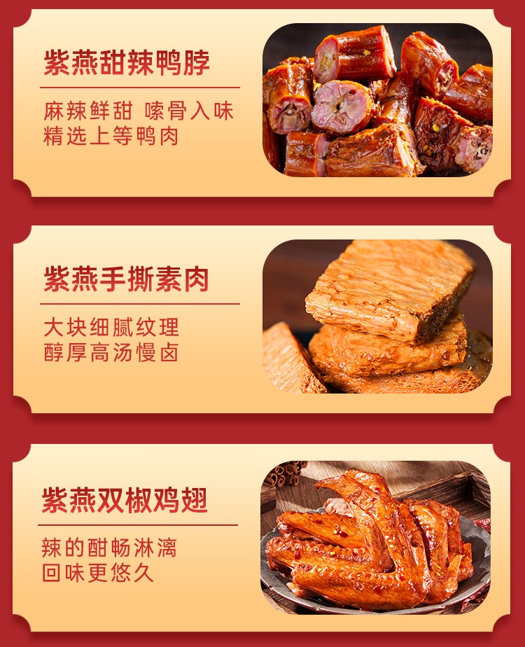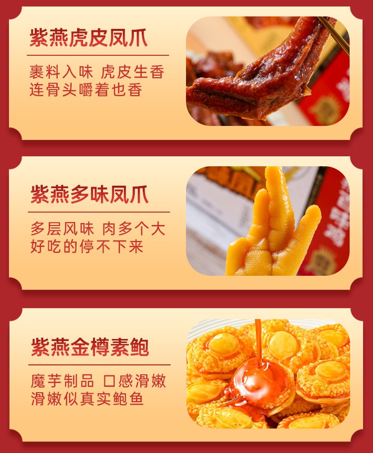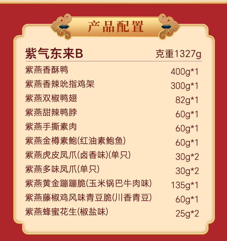 "紫燕香酥鸭400g 紫燕香辣吮指鸡架300g 紫燕双椒鸭翅82g 紫燕甜辣鸭脖60g 紫燕手撕素肉60g 紫燕金樽素鲍(红油素鲍鱼)60g 紫燕虎皮凤爪(卤香味)(单只)30g 紫燕虎皮凤爪(卤香味)(单只)30g 紫燕虎皮凤爪(卤香味)(单只)30g 紫燕虎皮凤爪(卤香味)(单只)30g 紫燕黄金蹦蹦脆(玉米锅巴牛肉味)135g 紫燕藤椒鸡风味青豆脆(川香青豆)60g 紫燕蜂蜜花生(椒盐味)25g 紫燕蜂蜜花生(椒盐味)25g 礼盒+组装+外盒"