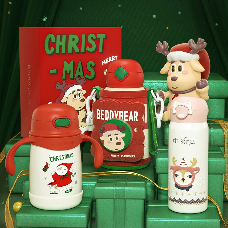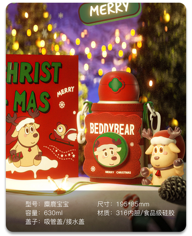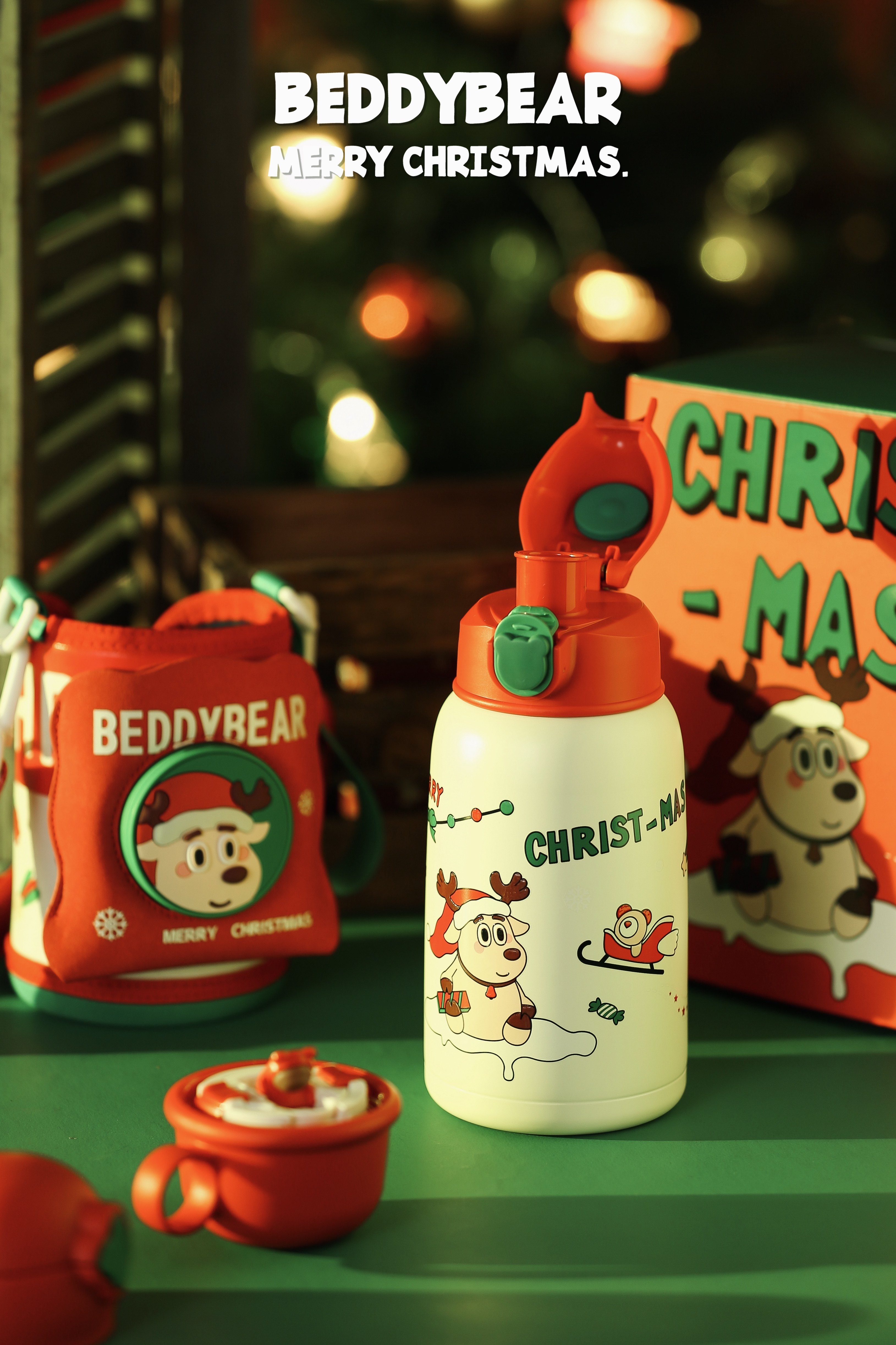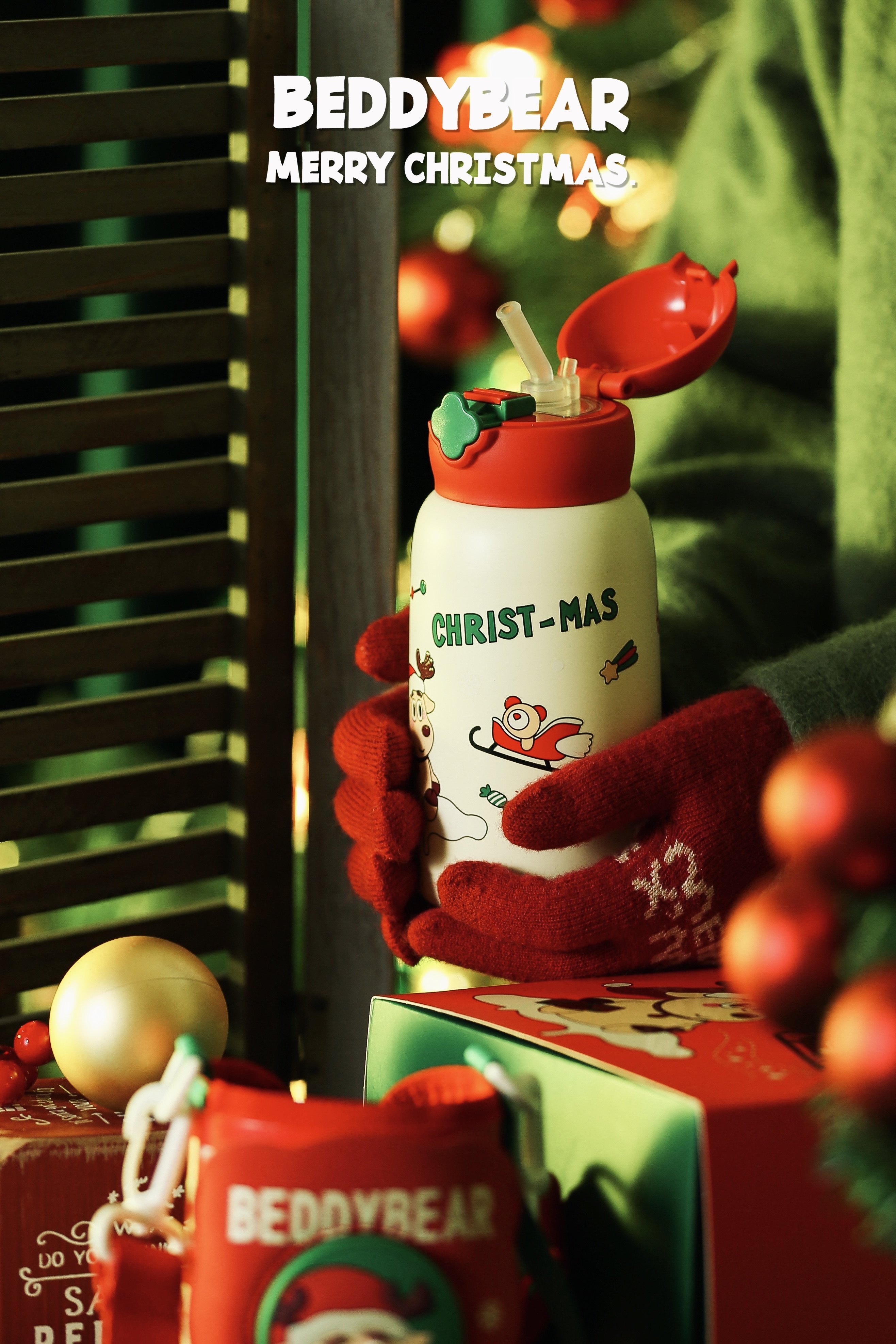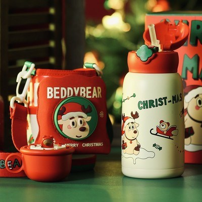 杯具熊圣诞保温杯儿童水壶带吸管宝宝学生便携防漏水湿巾杯子