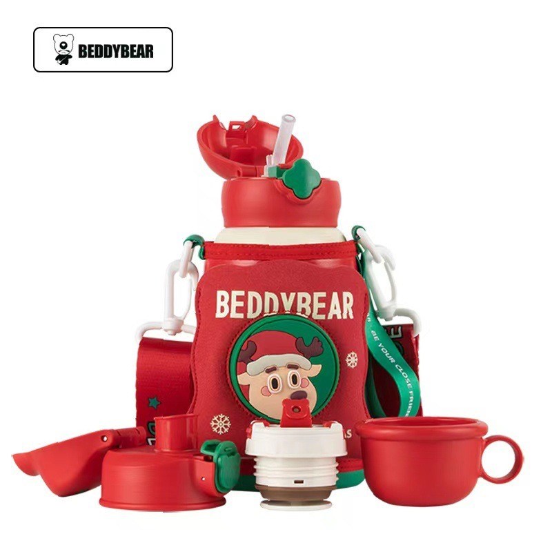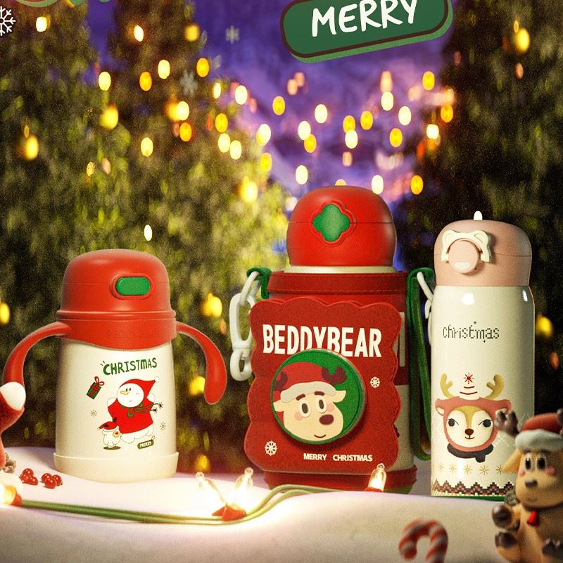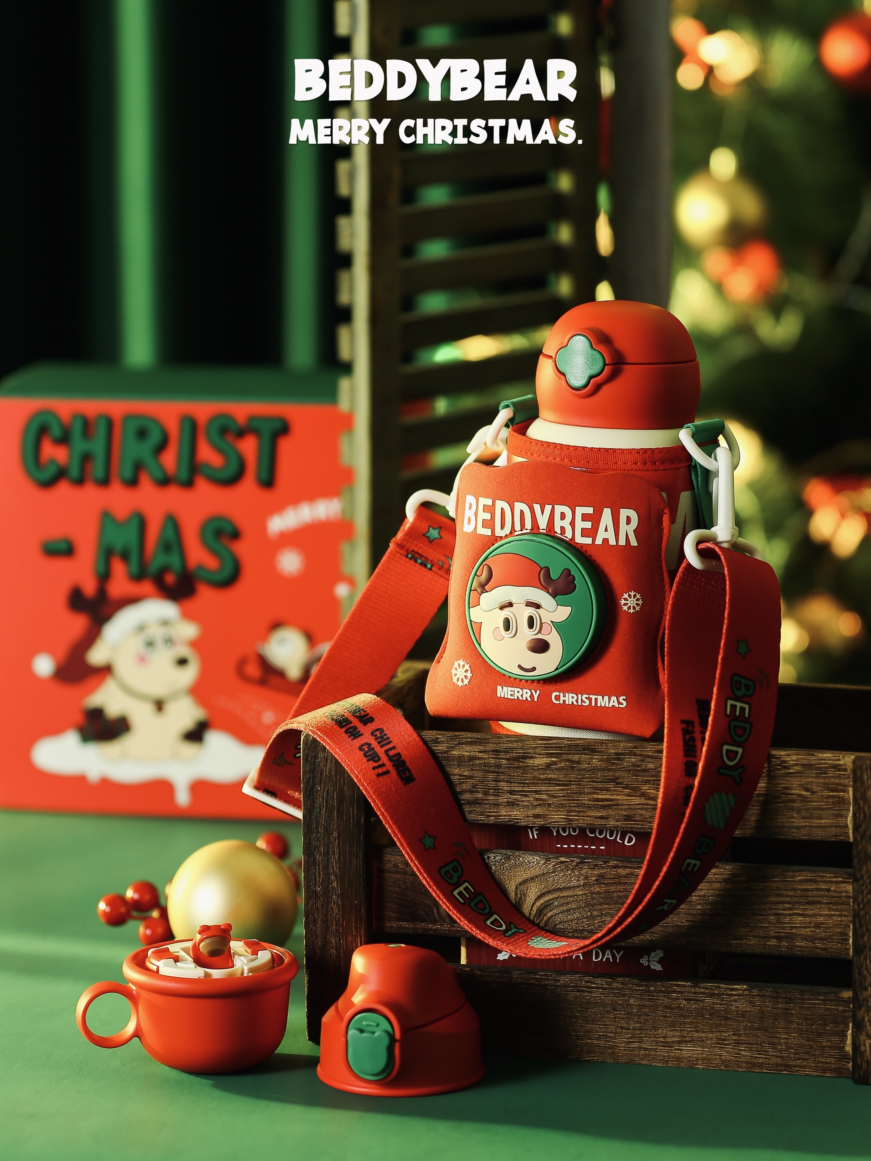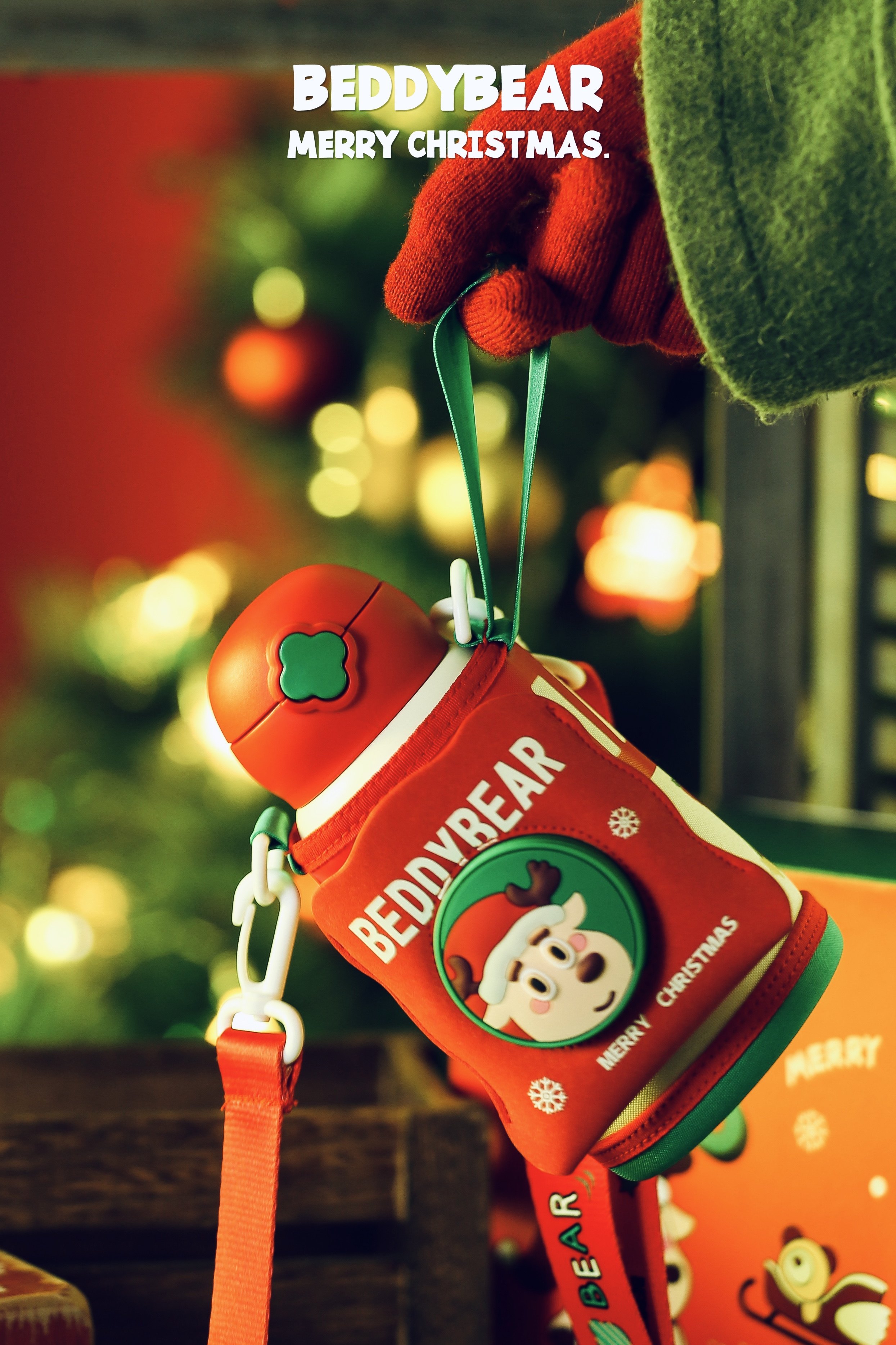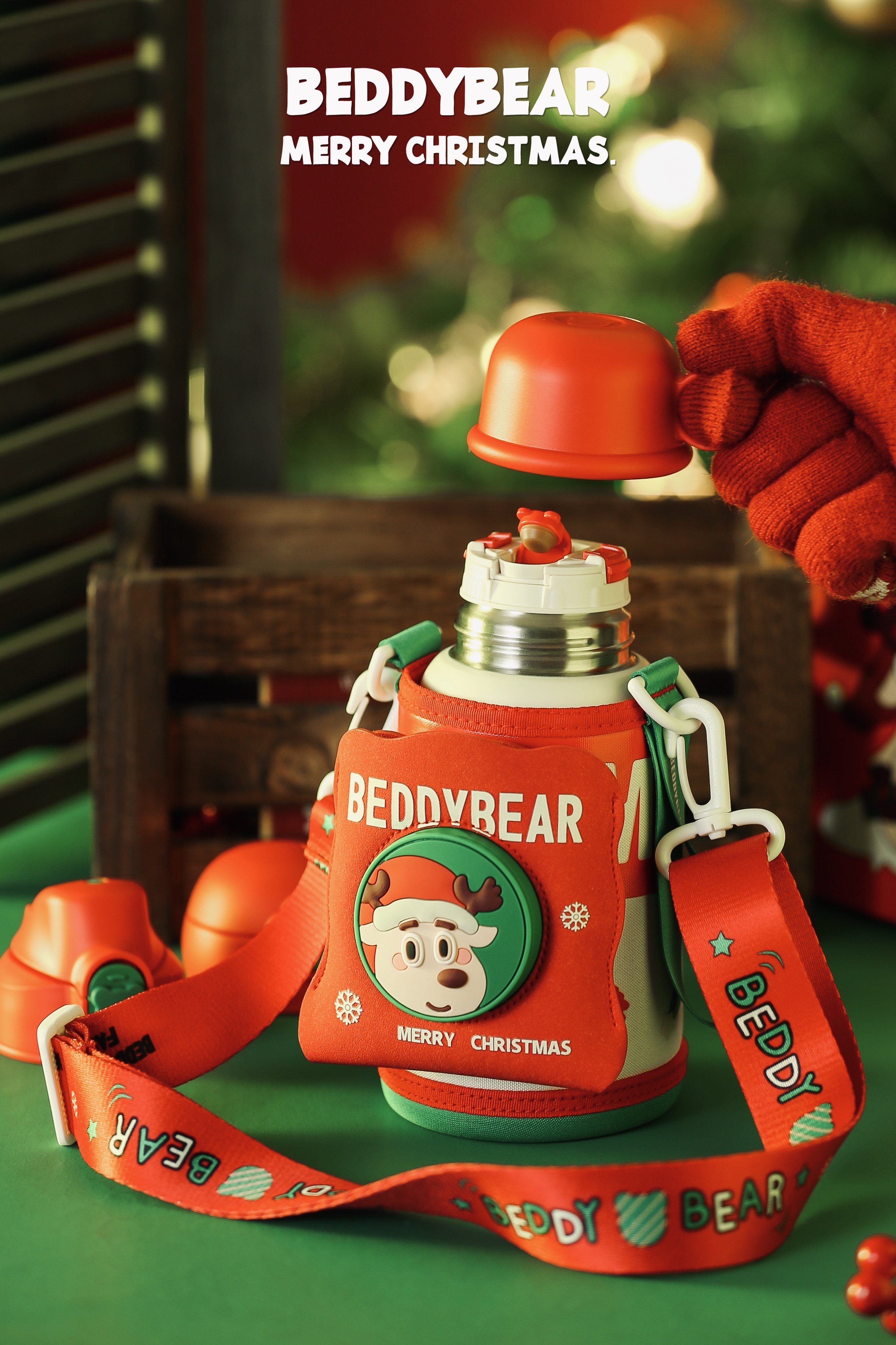 杯具熊圣诞保温杯儿童水壶带吸管宝宝学生便携防漏水湿巾杯子