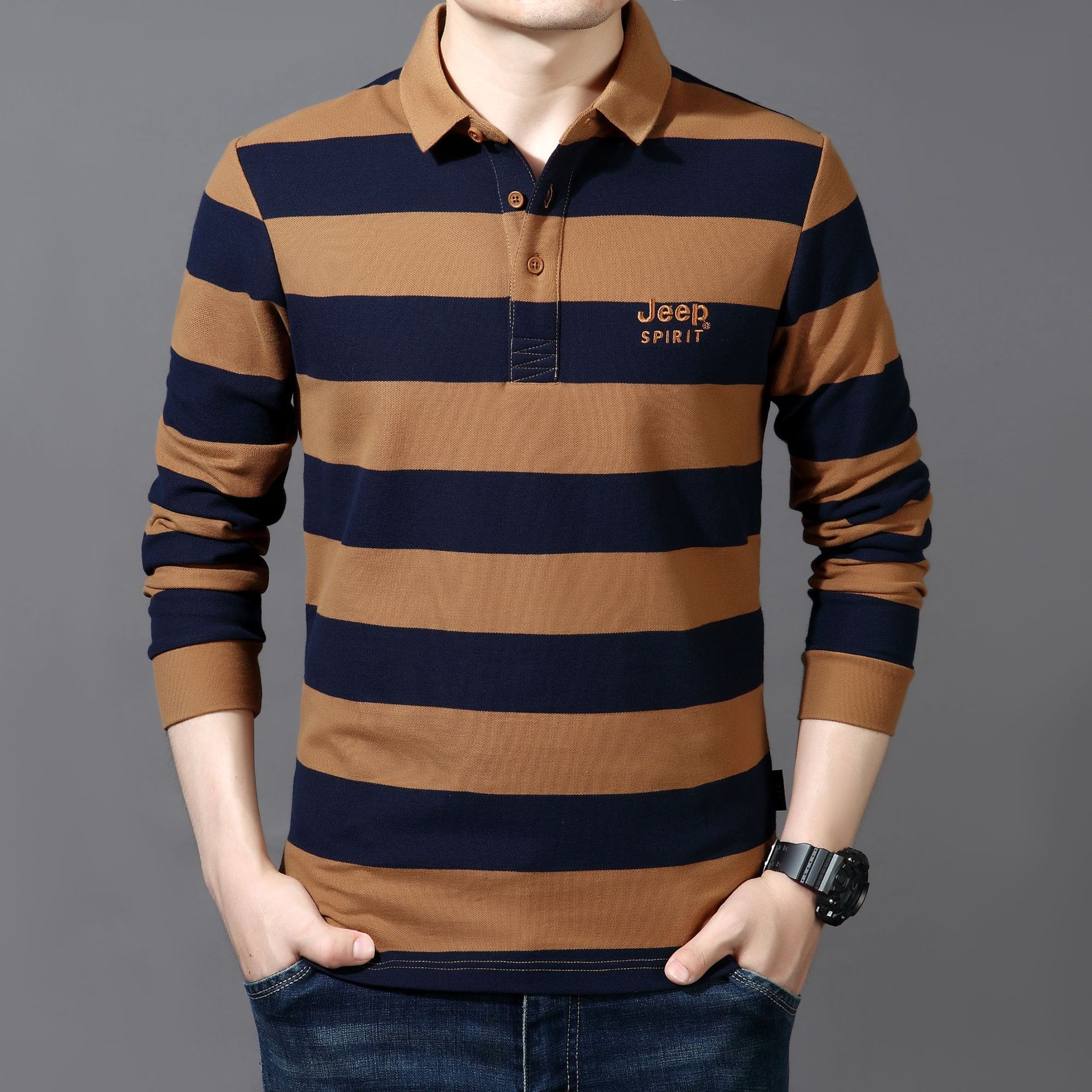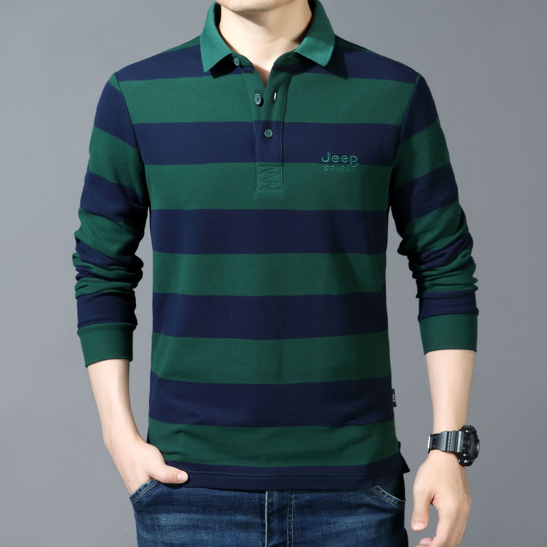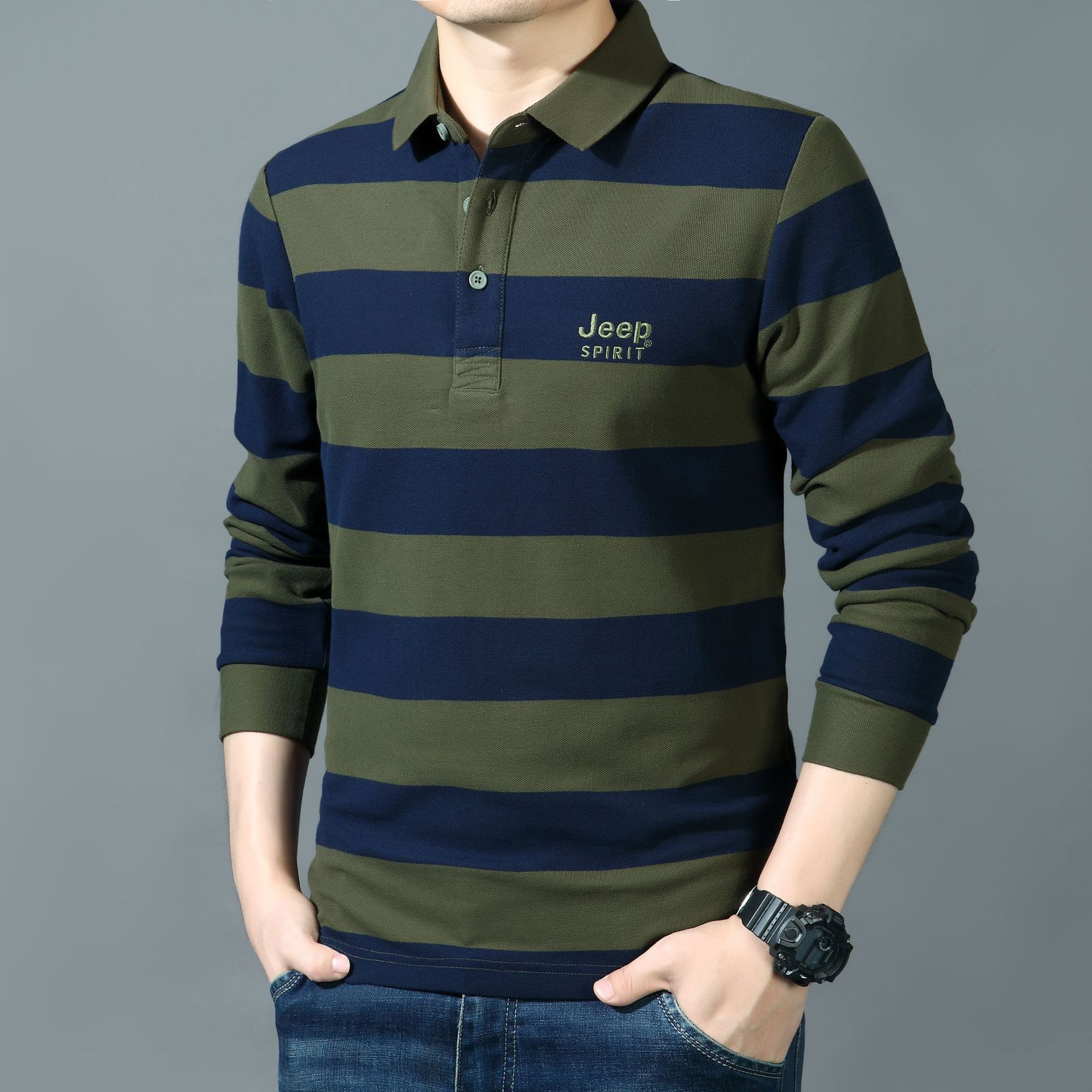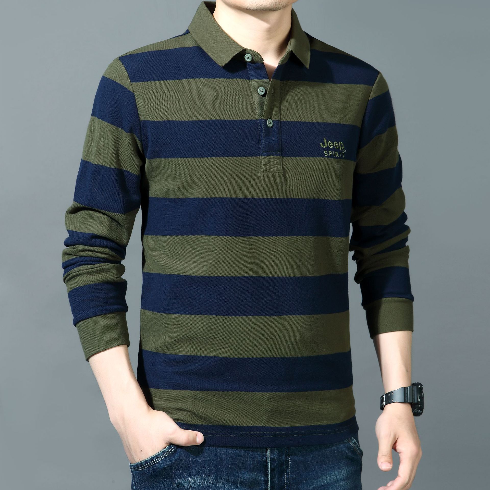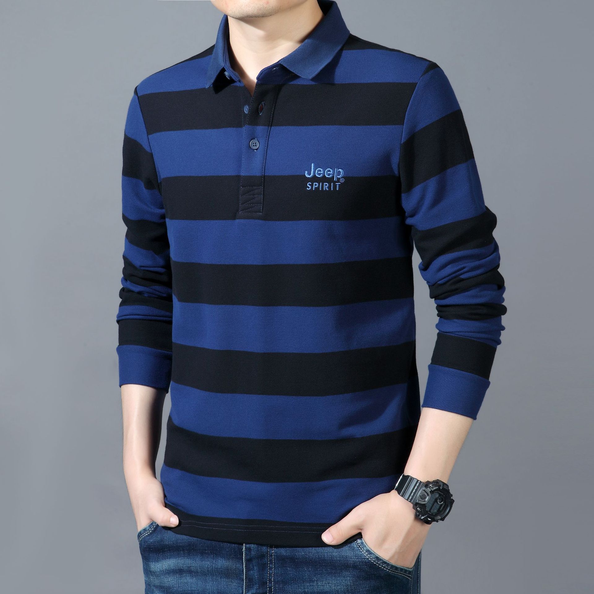 JEEP SPIRIT长袖T恤秋冬季男士中年条纹翻领打底商务宽松大码休闲polo衫PS5198