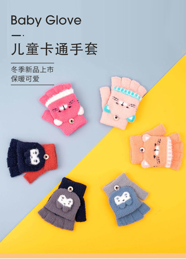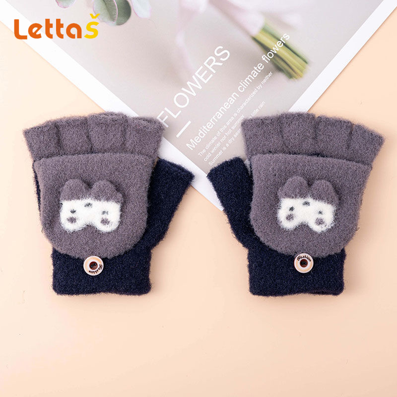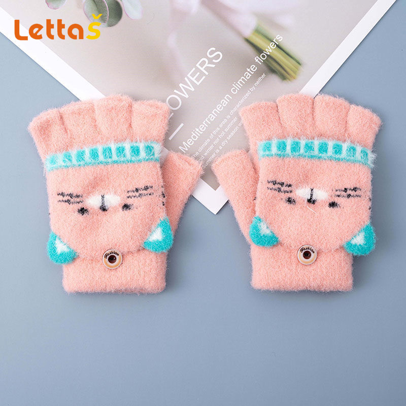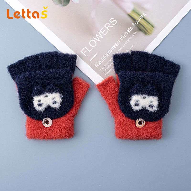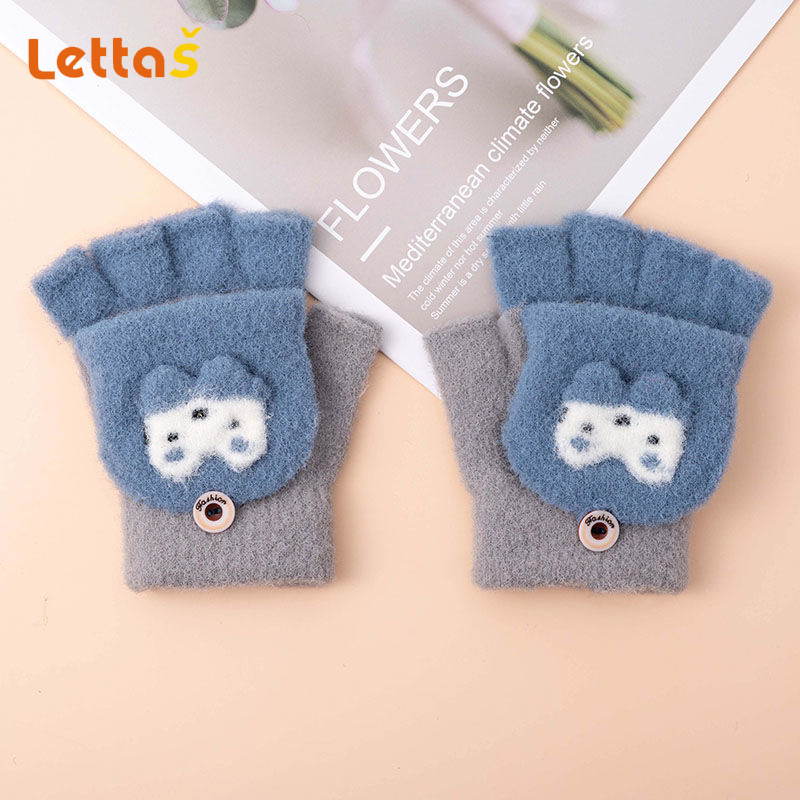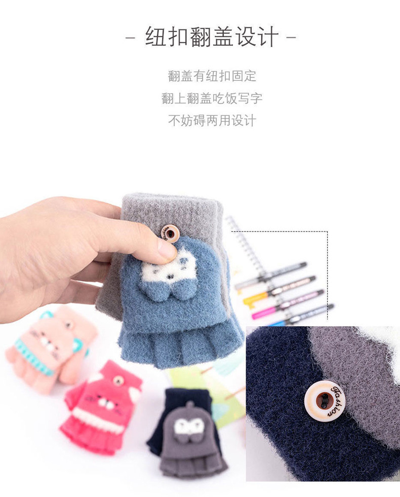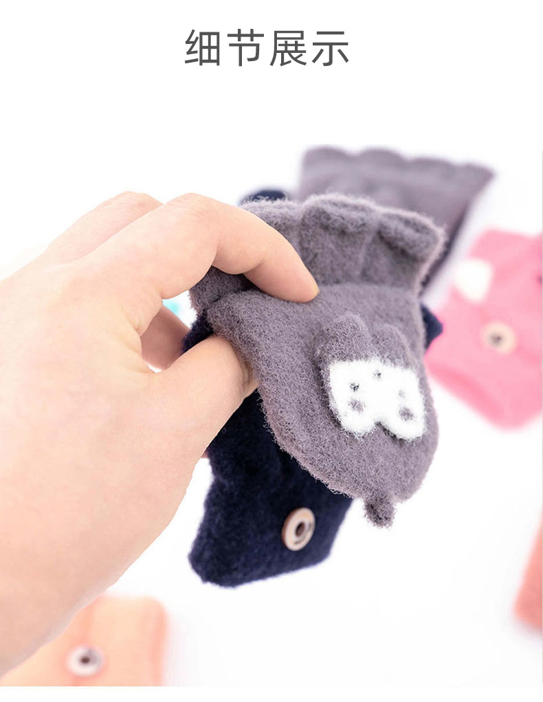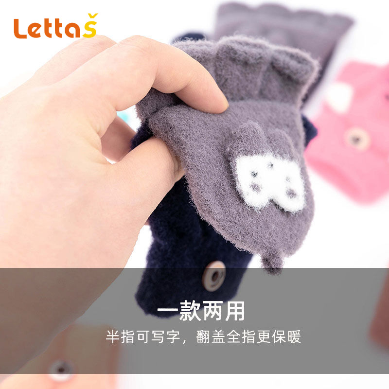 Lettas儿童手套半指冬季加绒加厚可爱毛绒保暖翻盖男女孩露指写字手套ST003