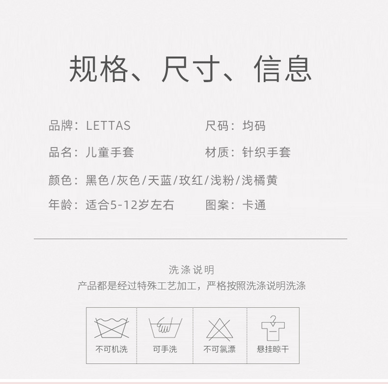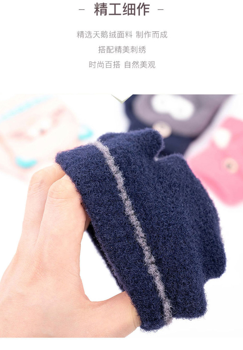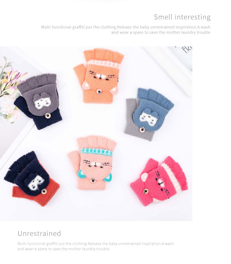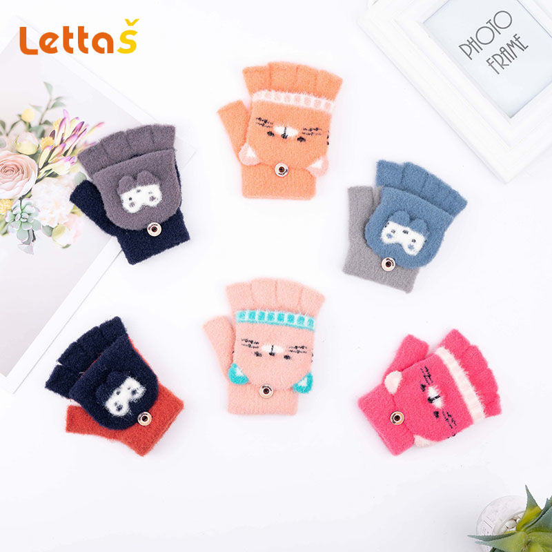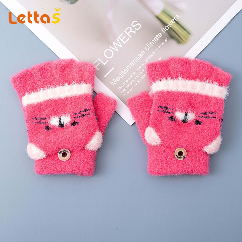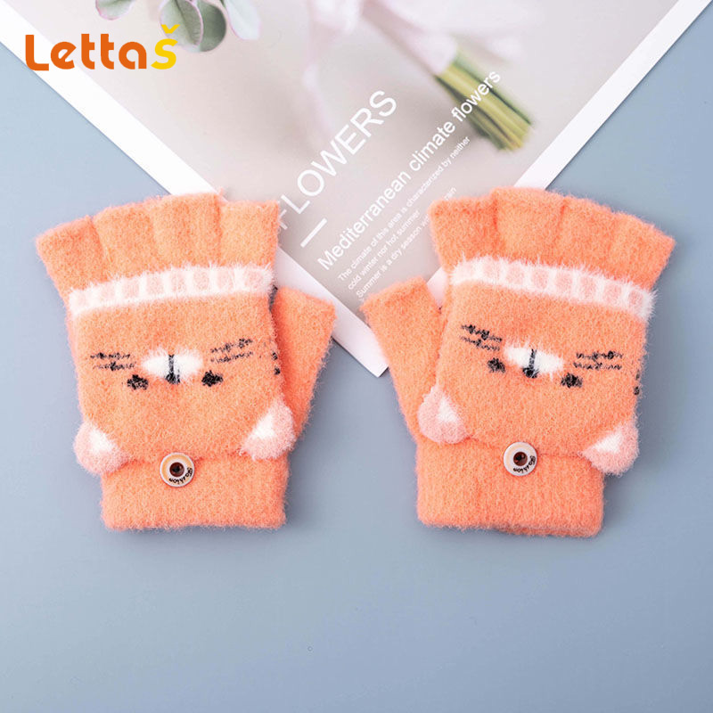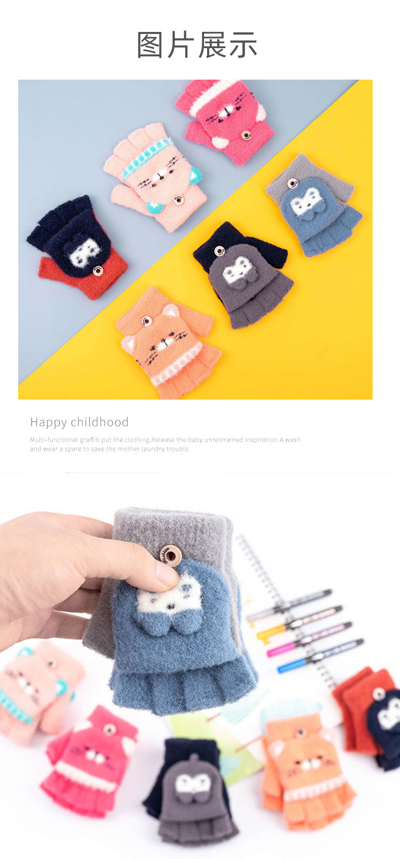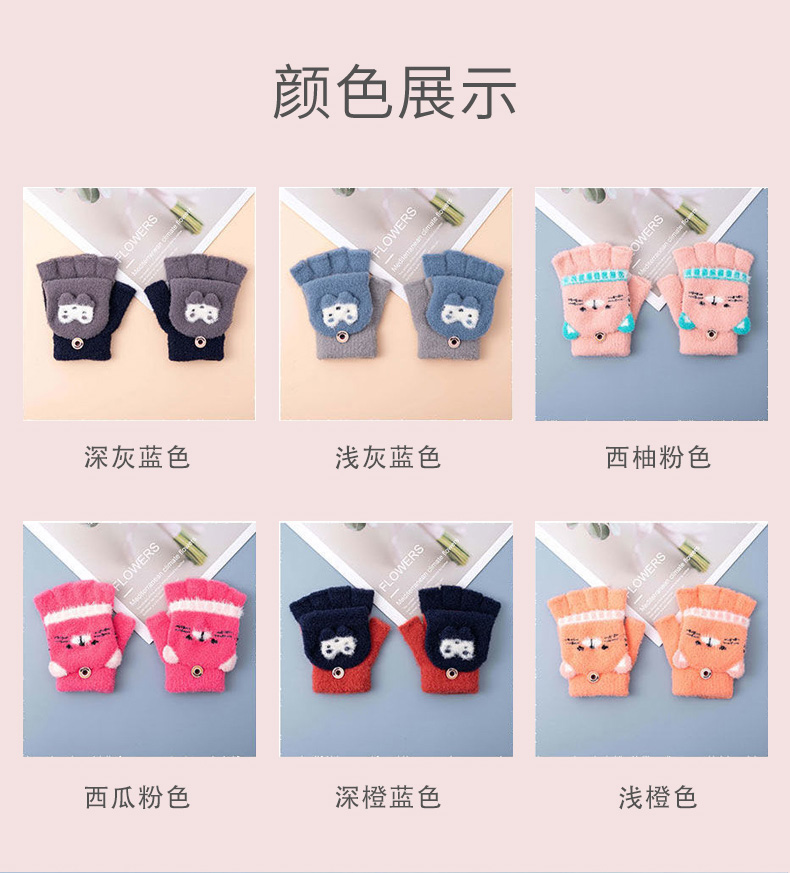 Lettas儿童手套半指冬季加绒加厚可爱毛绒保暖翻盖男女孩露指写字手套ST003