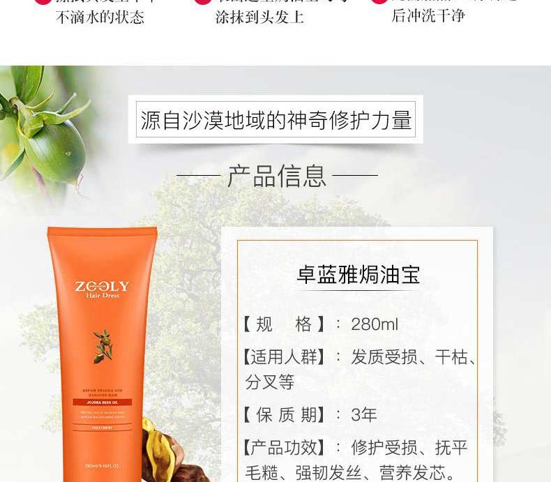 卓蓝雅(ZOOLY)焗油宝修护受损发质干枯分叉柔顺强韧发丝焗油膏 280ml 修护焗油宝