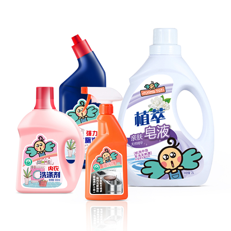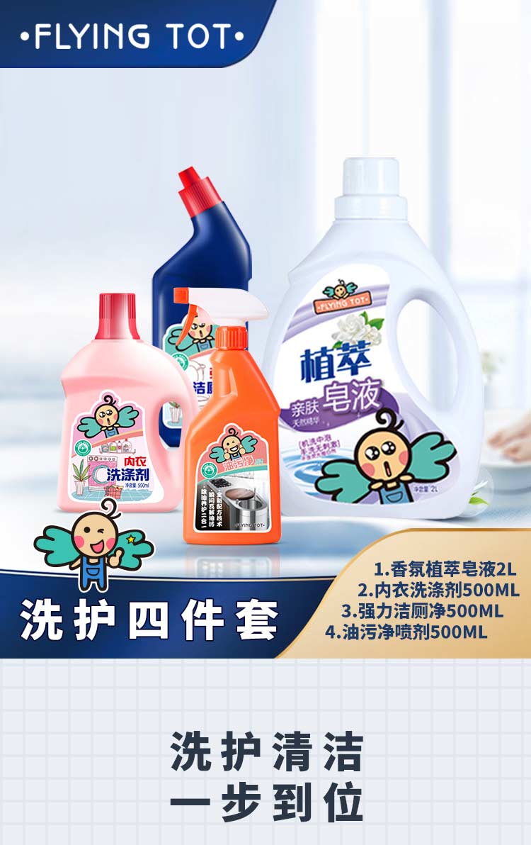 FLYING TOT飞行托托洗护四件套装X104套装 香氛植萃皂液2L+内衣洗涤剂500ML+强力洁厕净500ML+油污净喷剂500ML