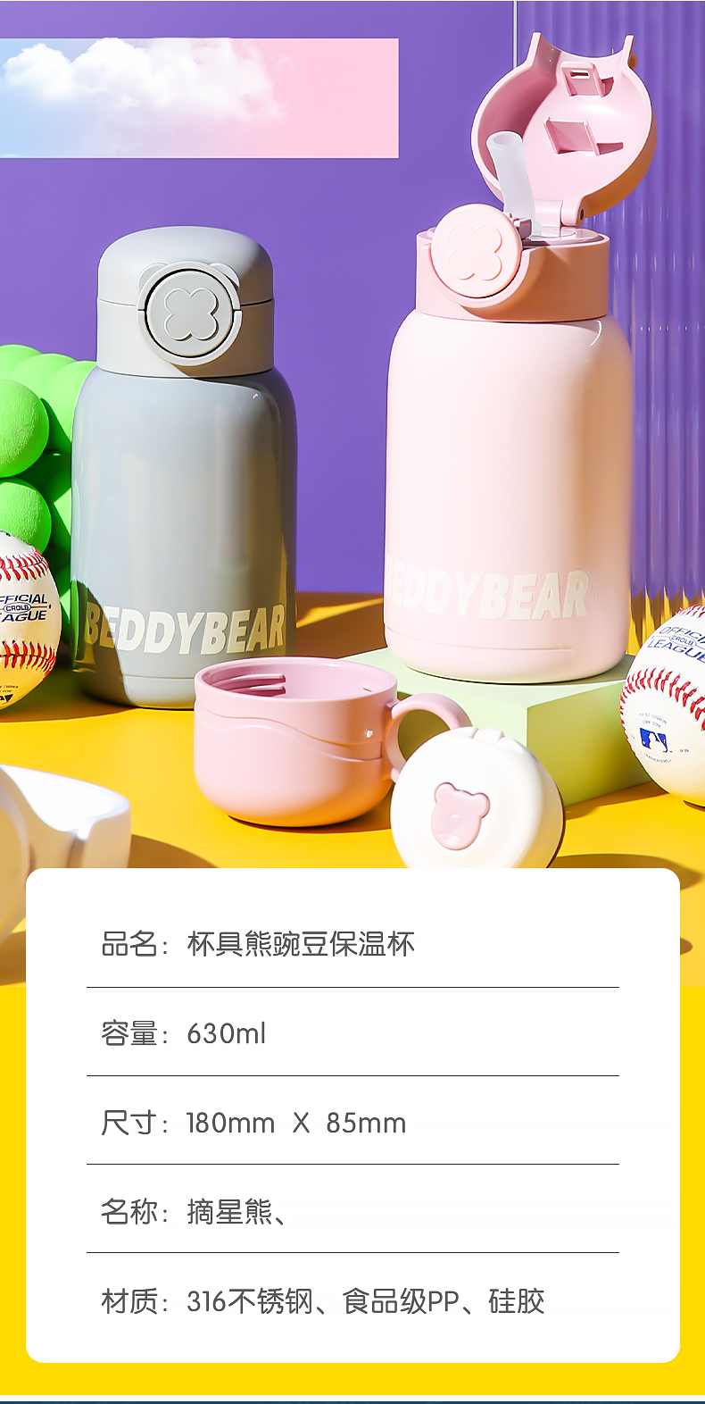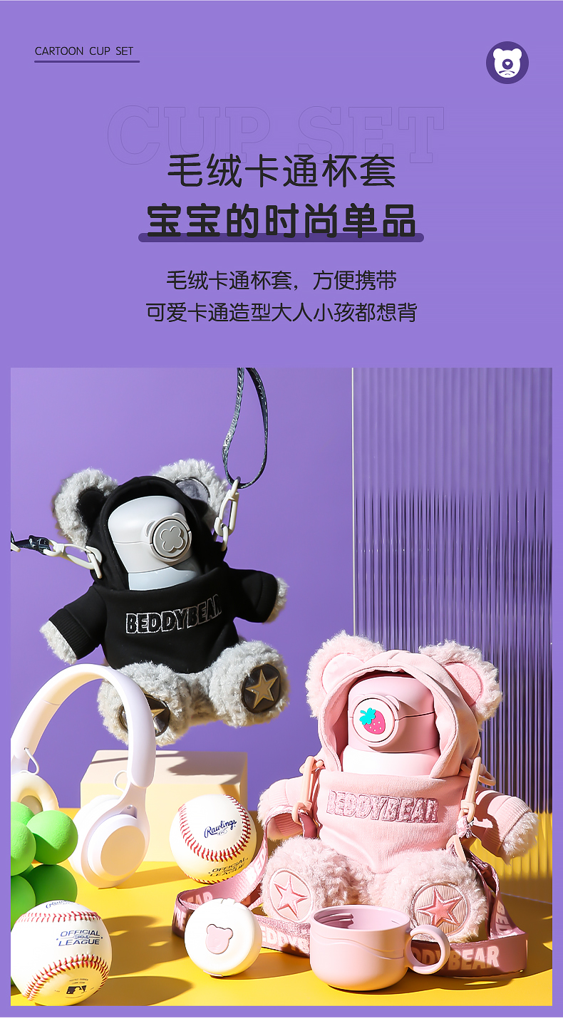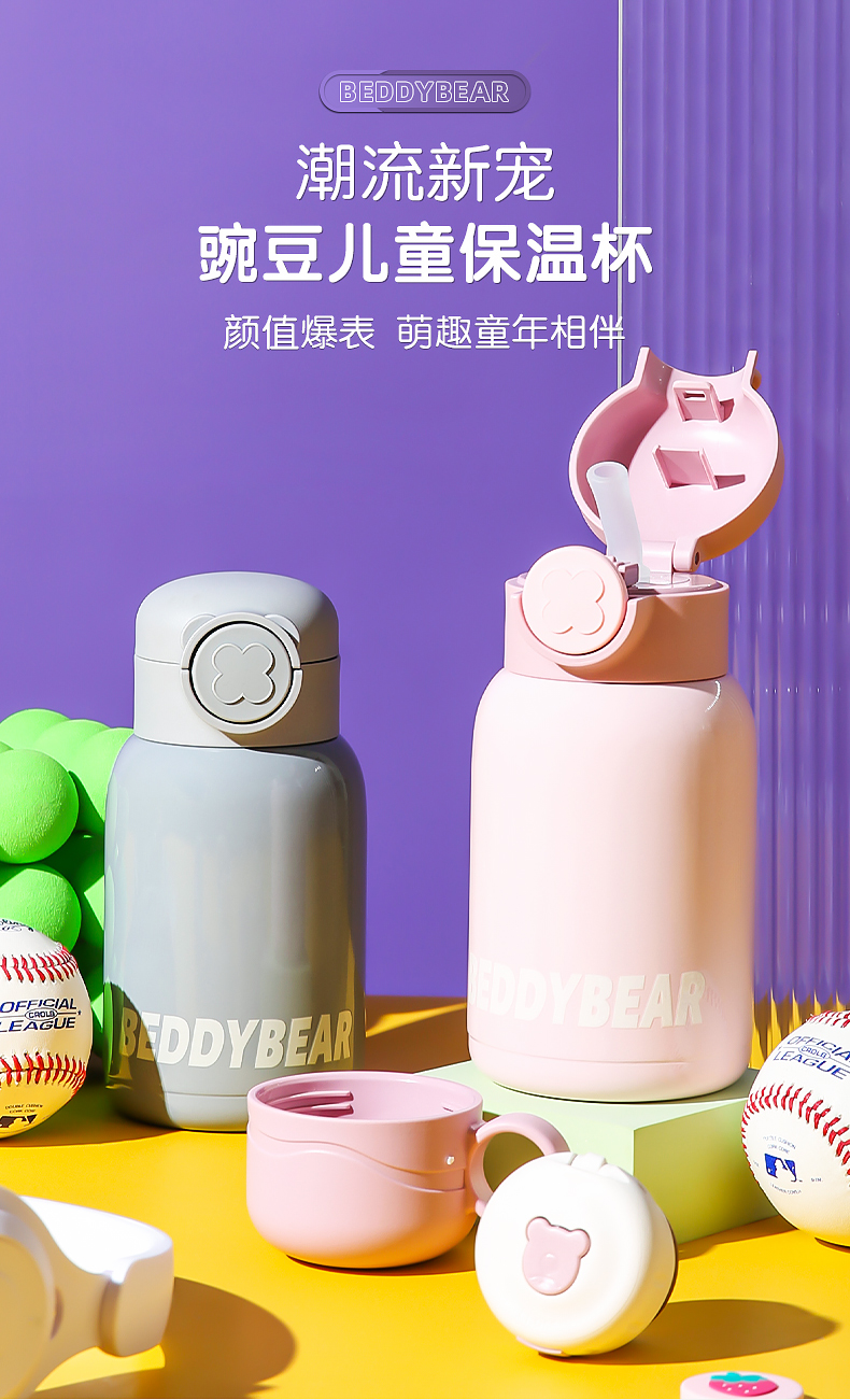 杯具熊豌豆儿童保温杯毛绒高颜值吸管杯小学生水壶宝宝幼儿园水杯
