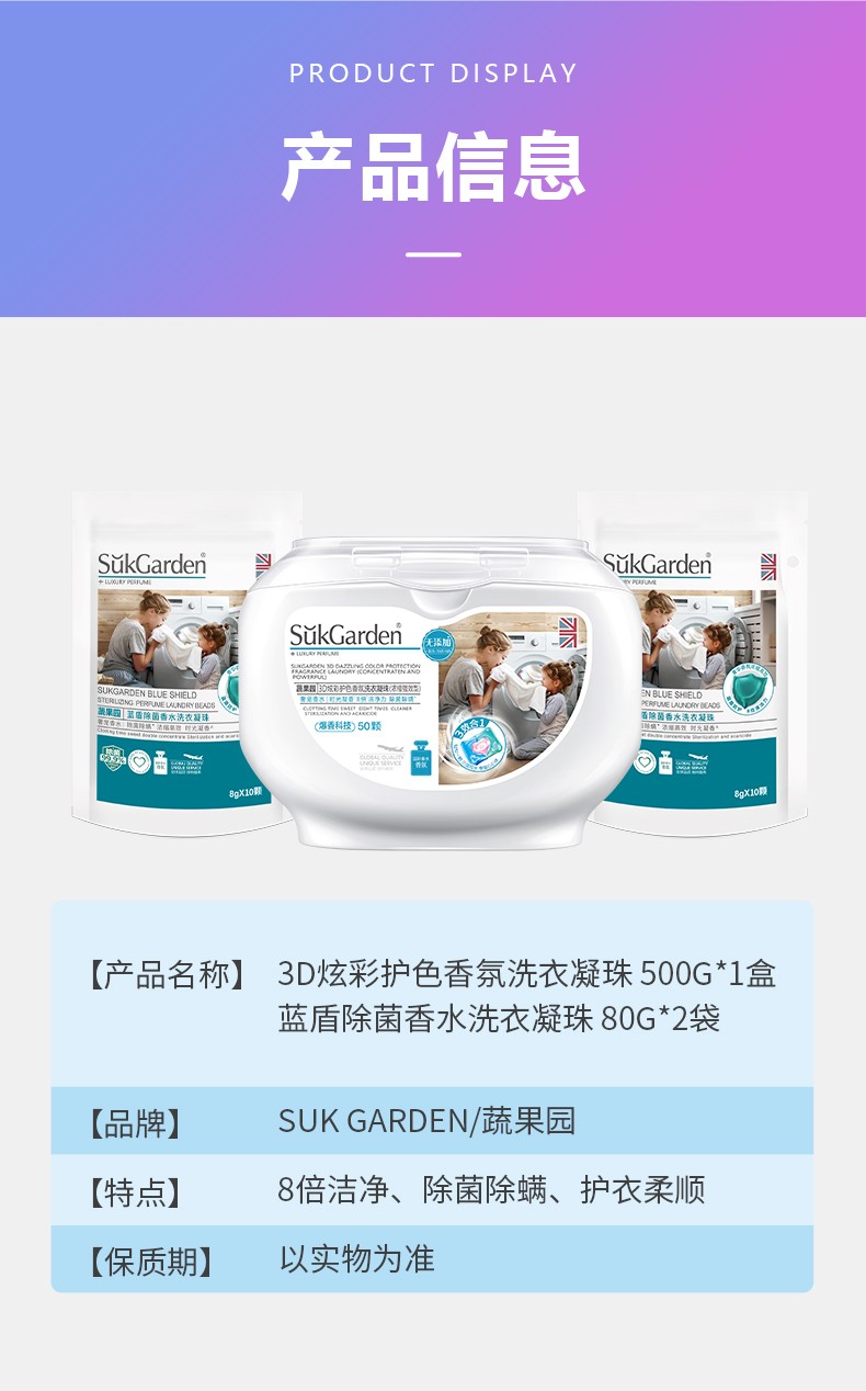 蔬果园3D洗衣凝珠(浓缩强效型)-10g*50颗*2盒+蔬果园白盾除菌香水洗衣凝珠-8g*10颗(袋装)*5袋