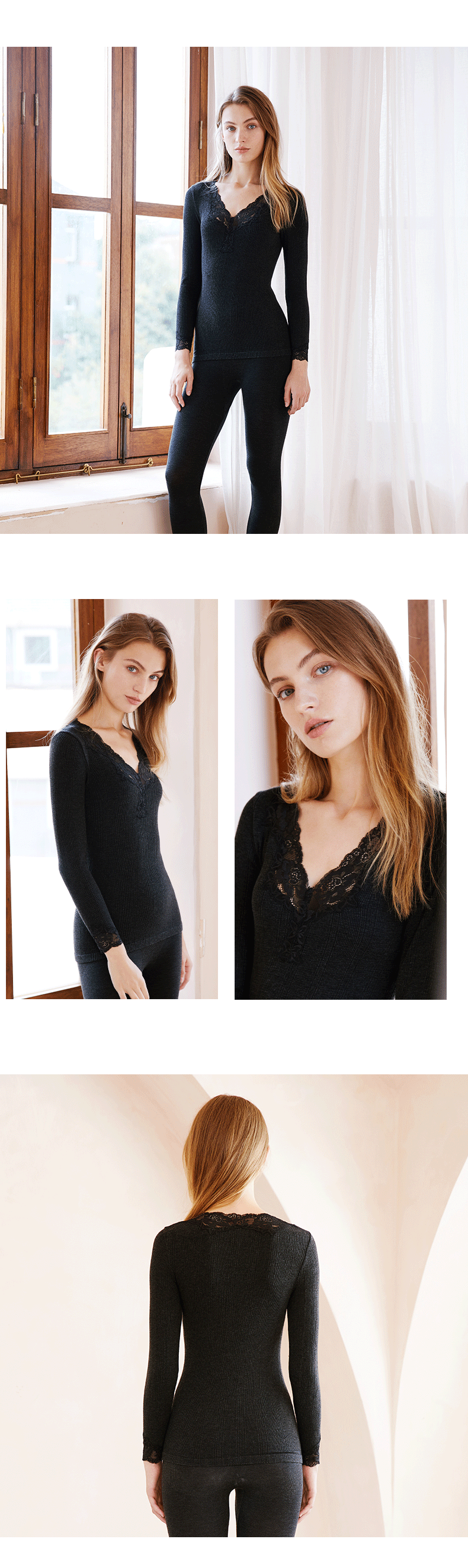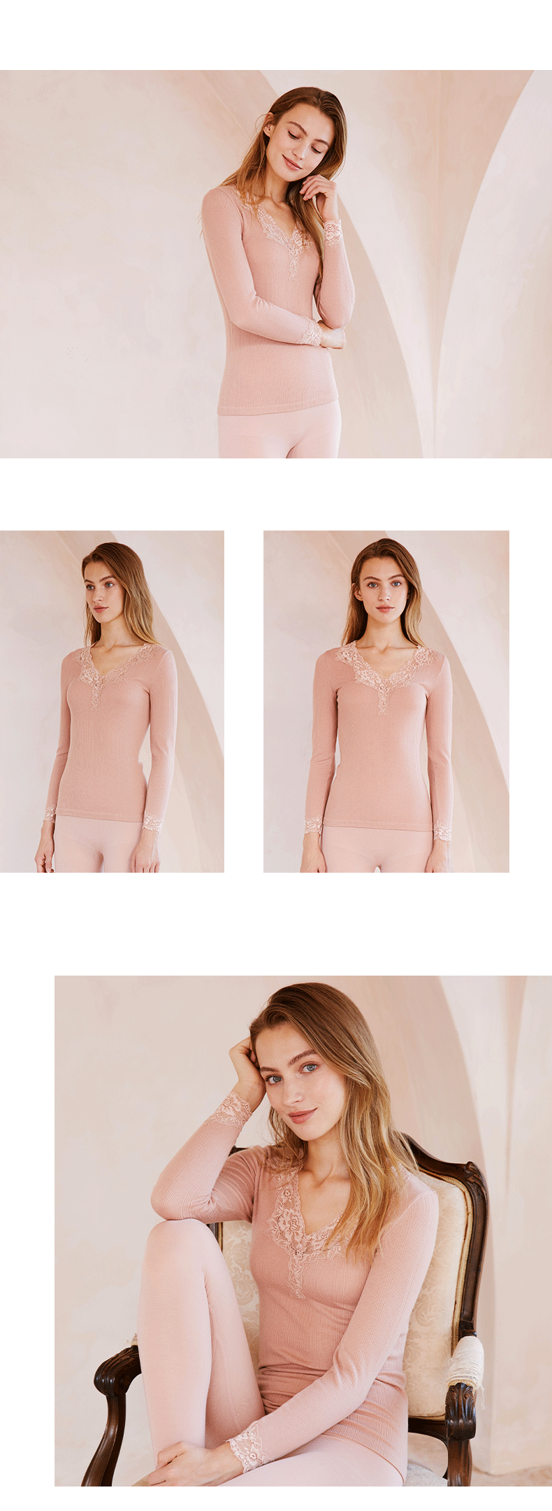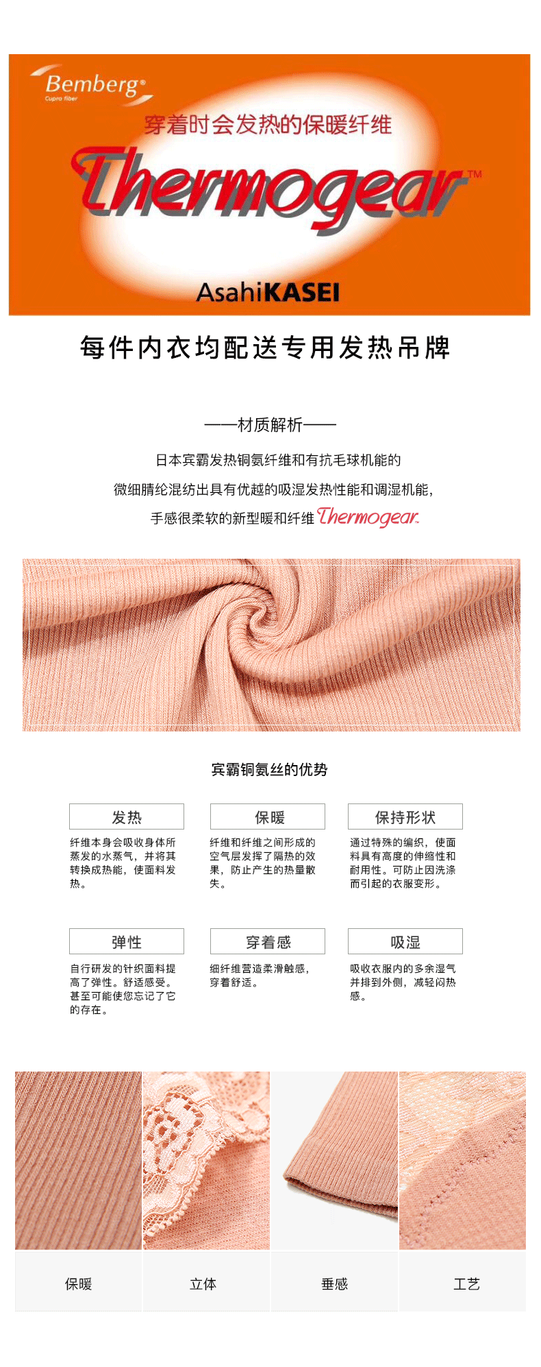 LomenD保暖内衣女士发热修身V领上衣秋冬季蕾丝美体打底衫秋衣秋裤套装TNC406