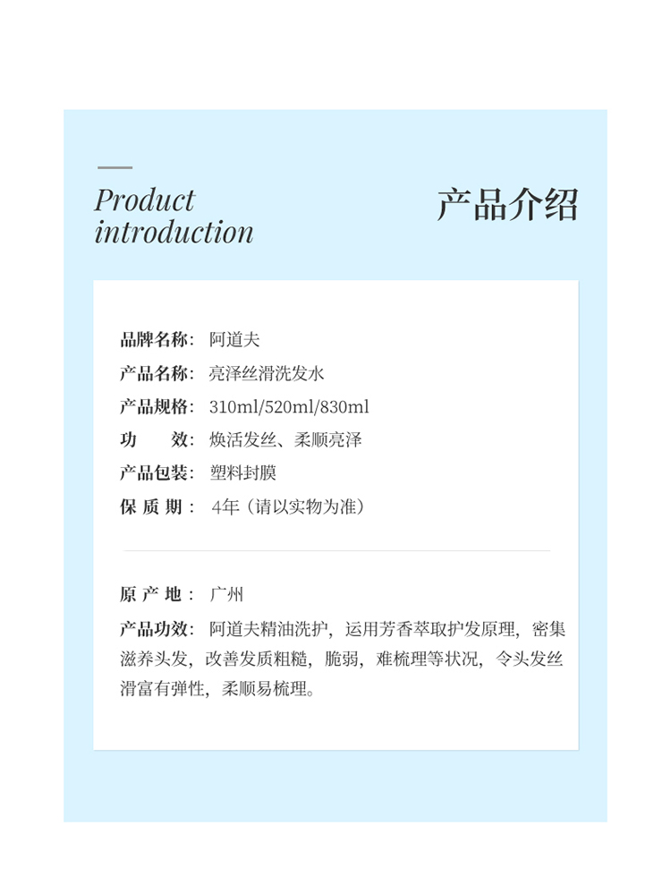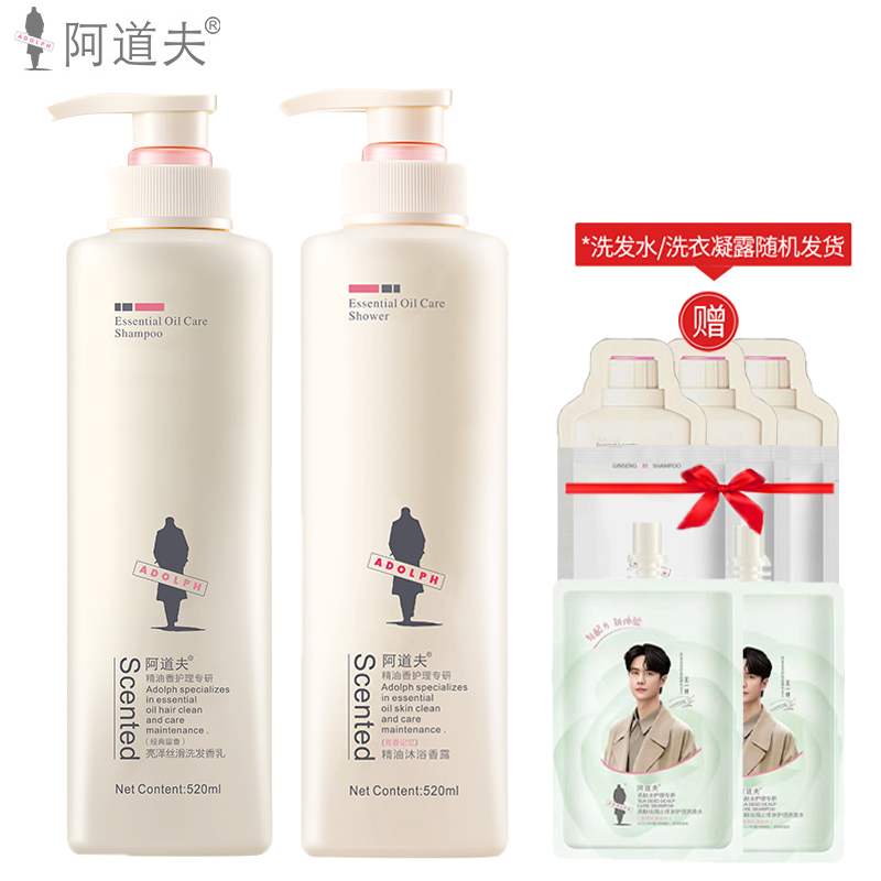 阿道夫洗发水沐浴露套装亮泽丝滑洗发水520ml+青春记忆沐浴露520ml+50ml*2+10ml*6(赠品香型随机发)