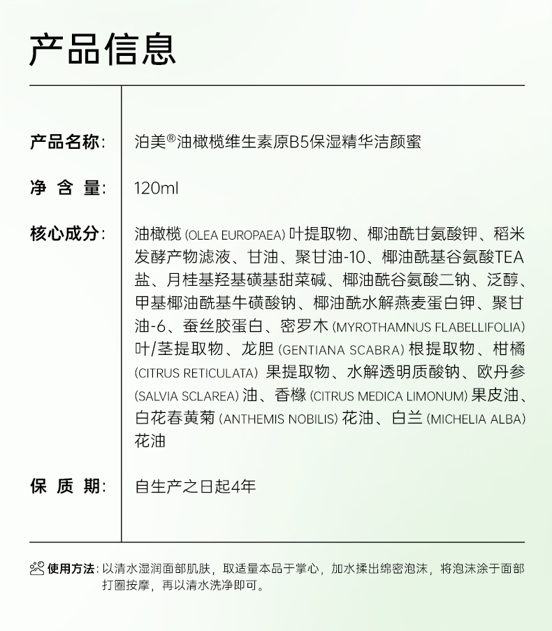 个护美妆>面部护理>洁面> 泊美 油橄榄维生素原B5保湿精华洁颜蜜 120ml