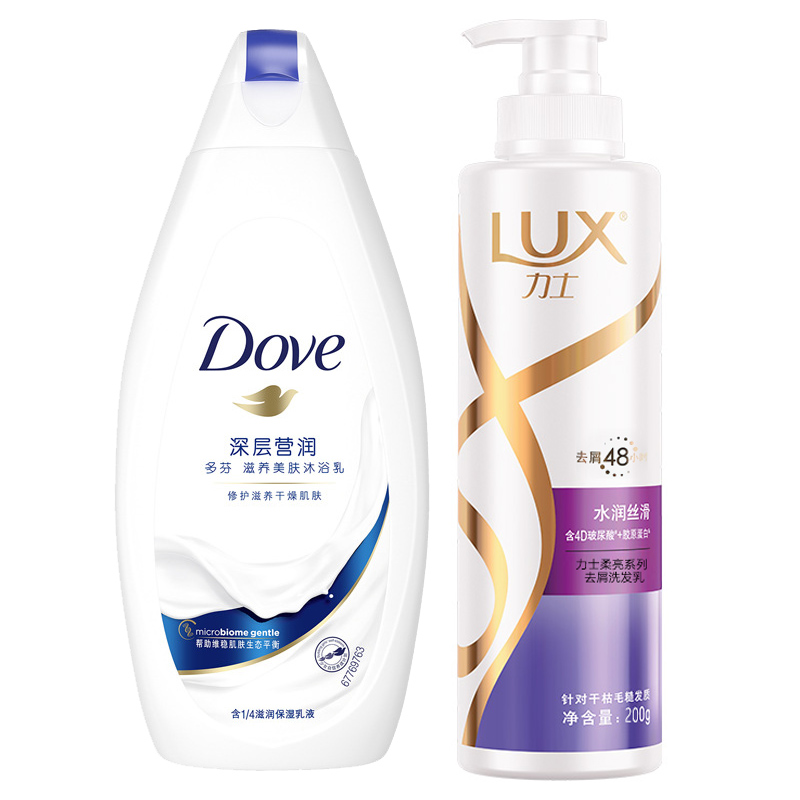 个护美妆>个人洗护>洗发水/洗发露> 多芬深层营润滋养美肤沐浴乳200ml+力士水润丝滑洗发水清爽去屑型200ml+三奇湿纸巾2包