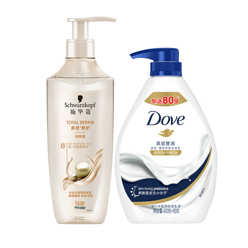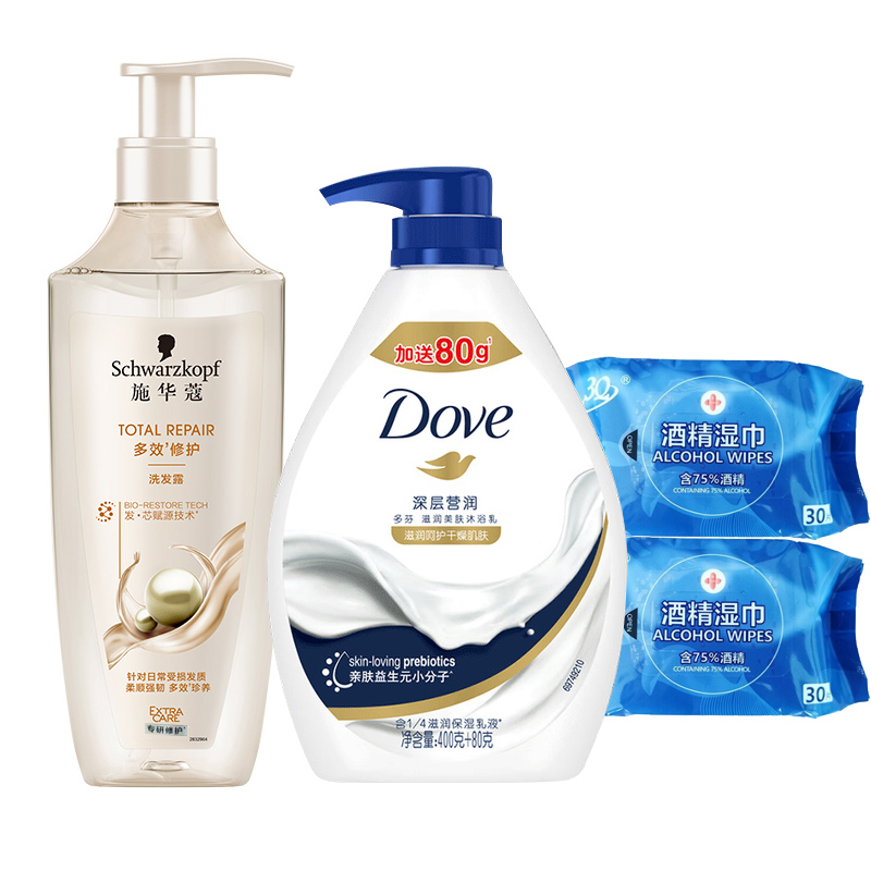 施华蔻多效修护洗发露400ml+多芬深层营润滋养美肤沐浴乳480ml/瓶+2包三奇酒精湿巾