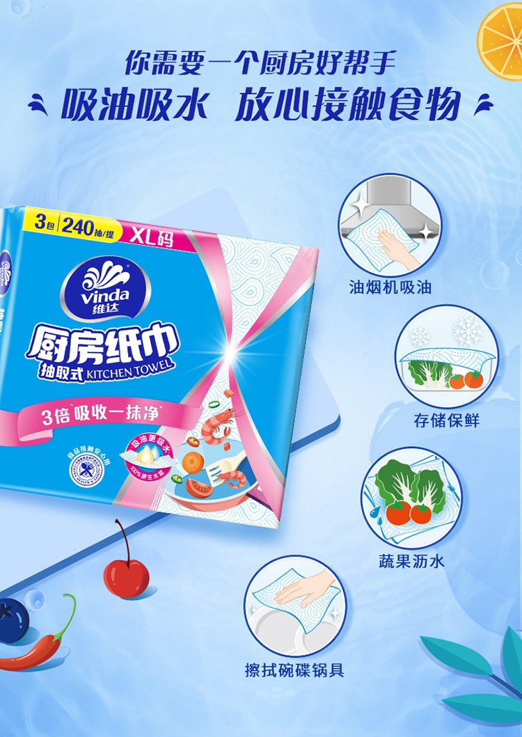 日用百货>居家日用>纸品纸巾> 维达V2241抽取式厨房纸巾2层80抽*3包