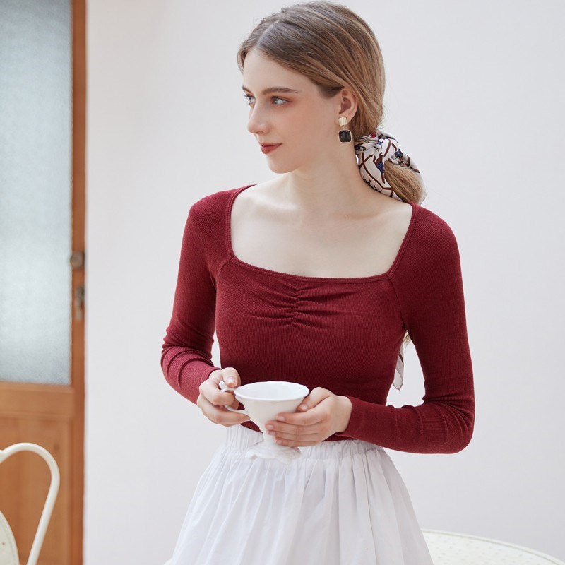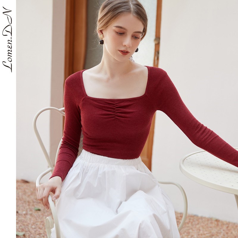 Lomen.DN秋冬新款复古方领保暖女士打底衫长袖露锁骨气质洋气发热内搭上衣GA112-A