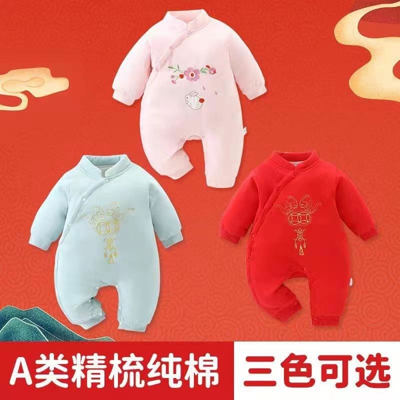 Honeyson秋冬新款婴幼儿连体衣大红色拜年服宝宝满月爬服加厚保暖哈衣B081