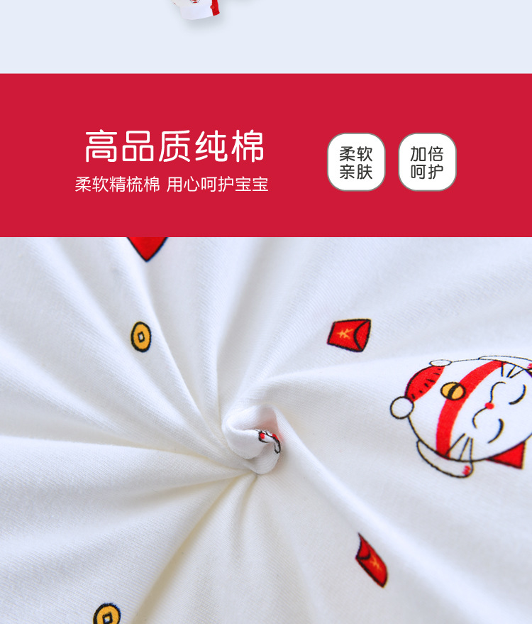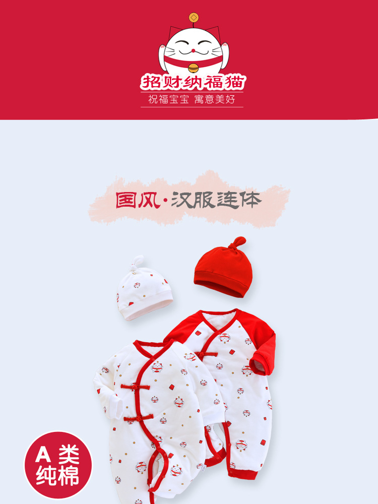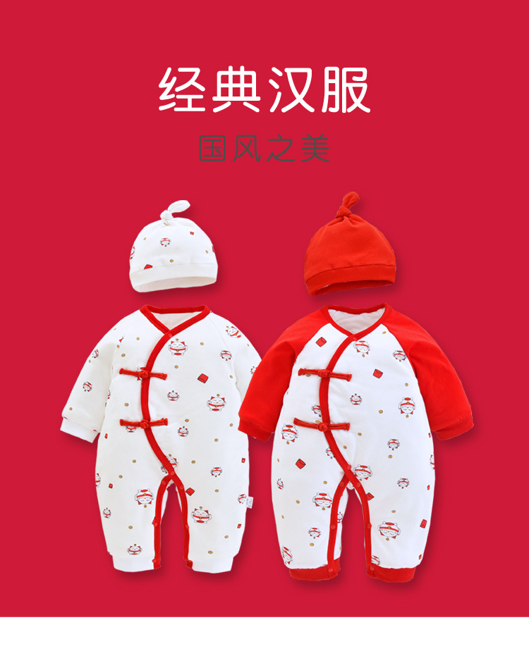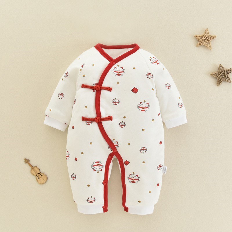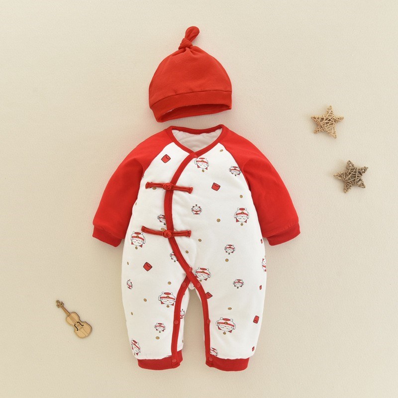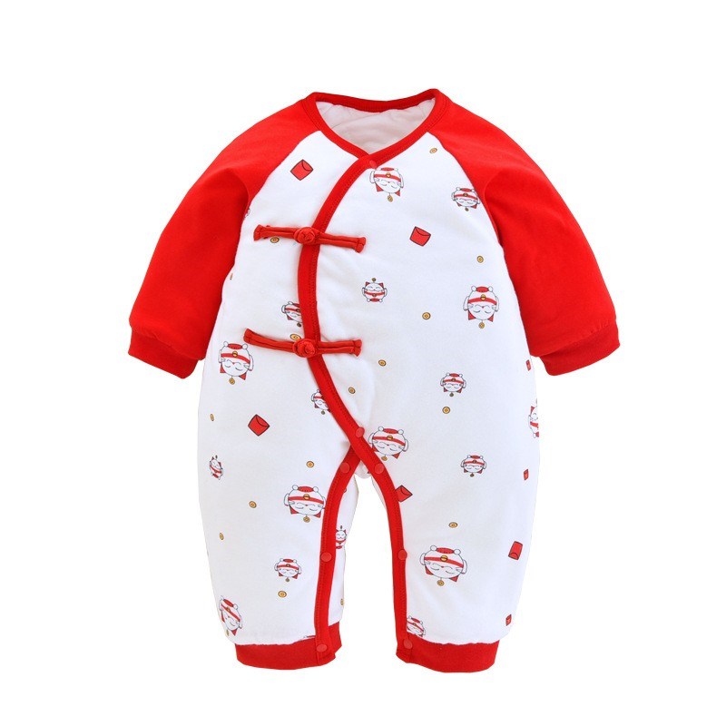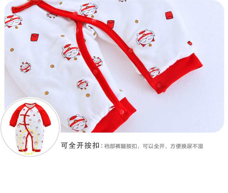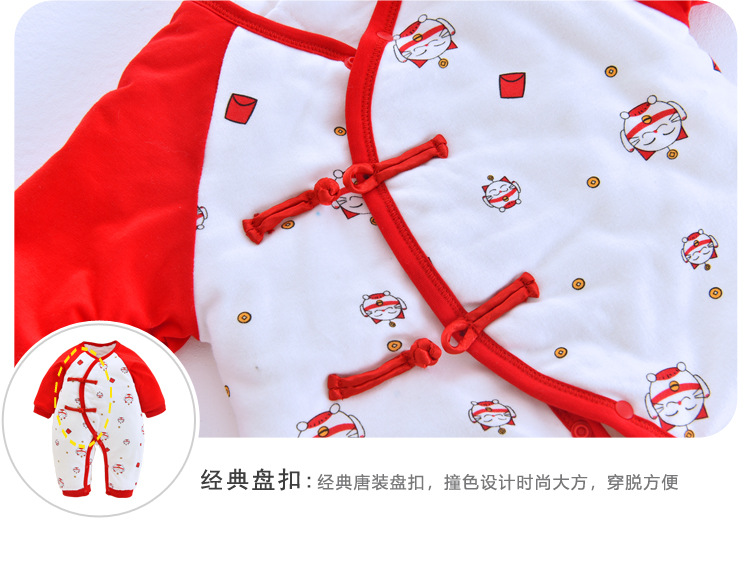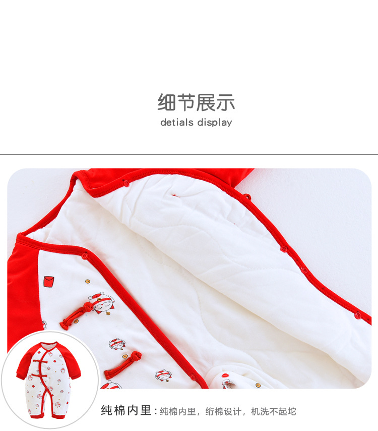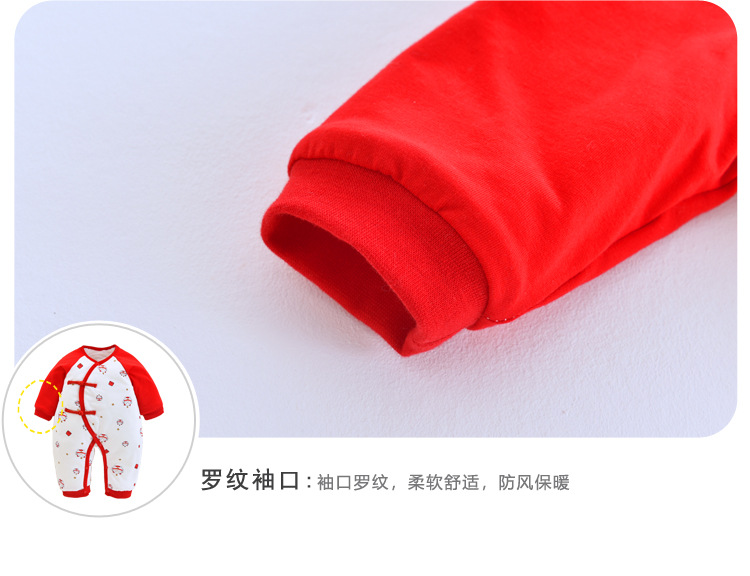 Honeyson中国风婴儿连体衣秋冬季加厚宝宝爬服新生儿大红色拜年服L002