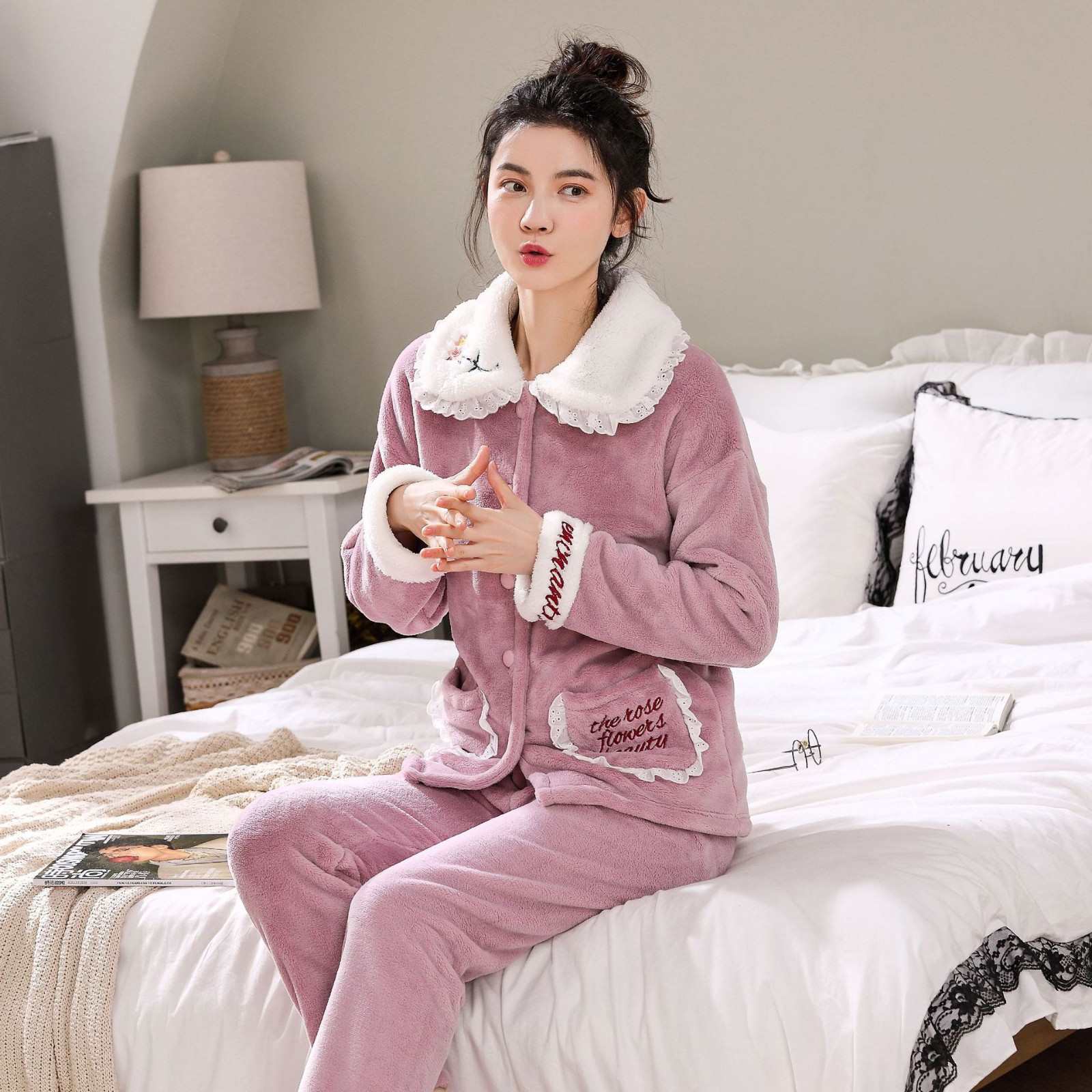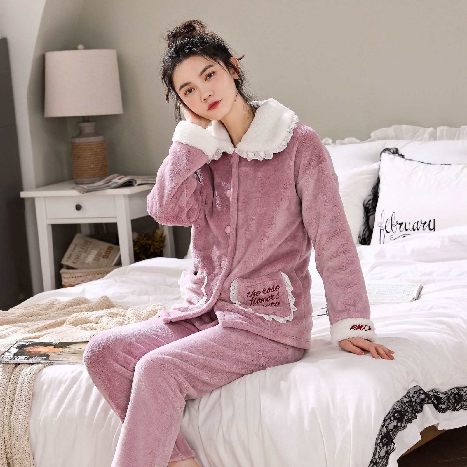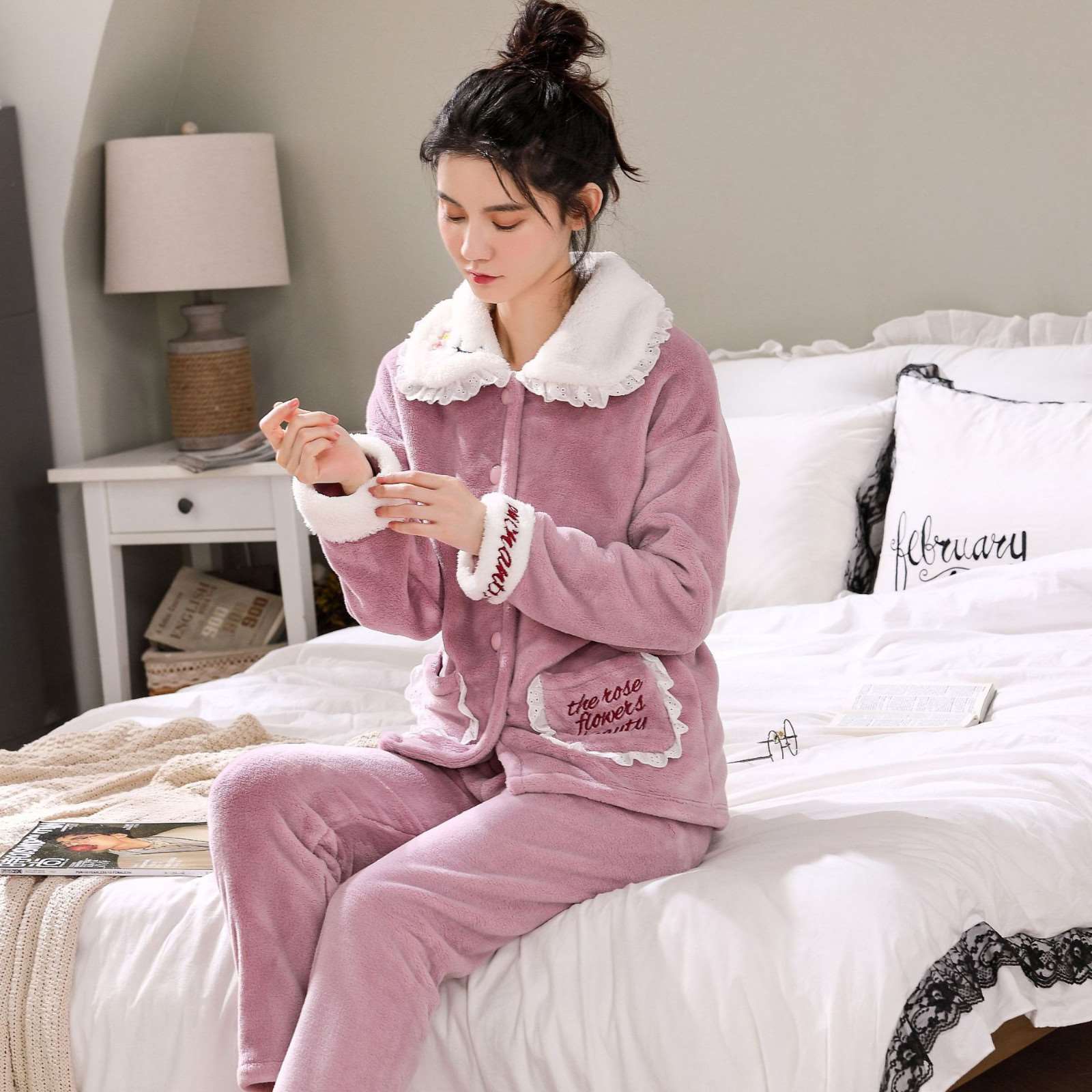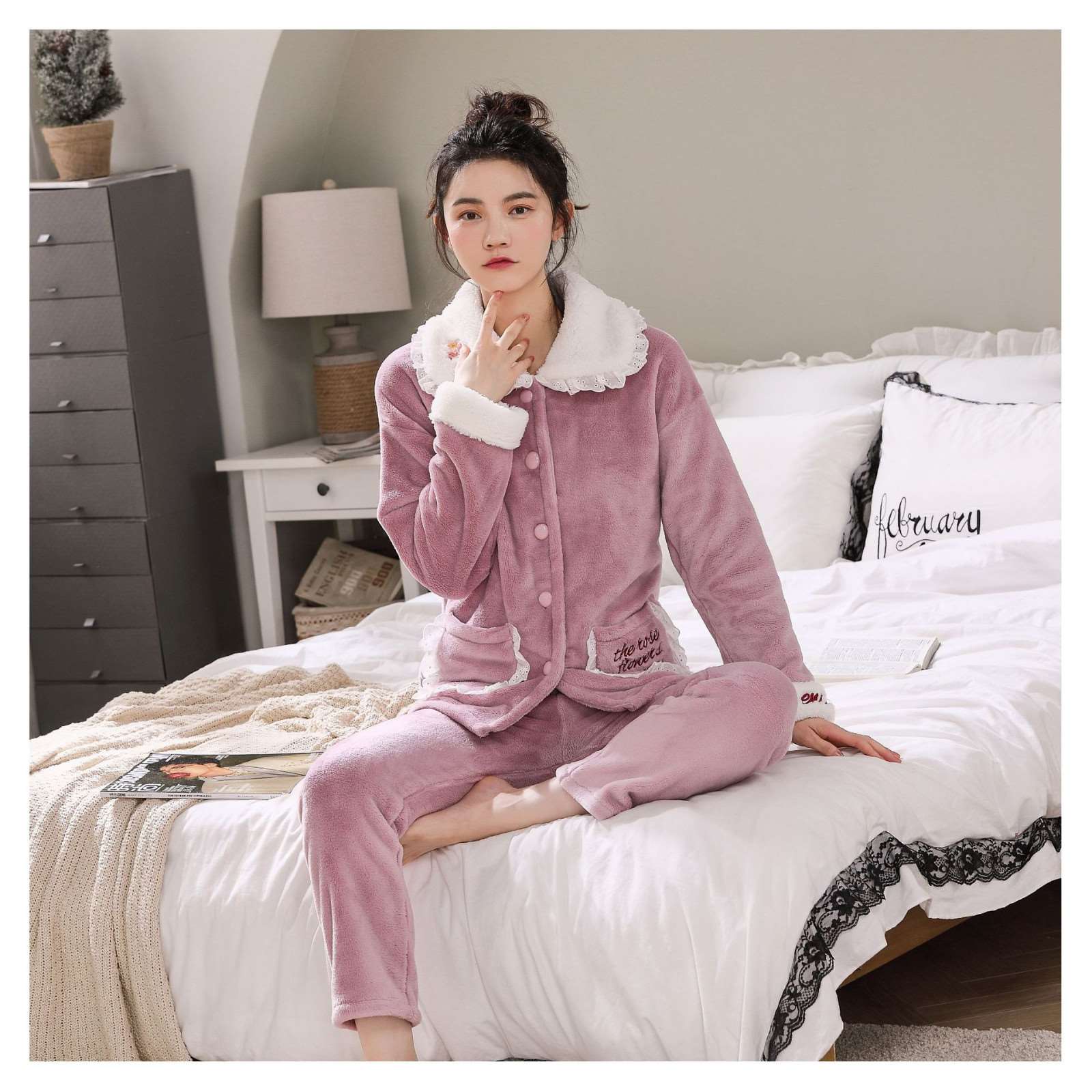 海谜璃秋冬季法兰绒睡衣女冬加厚加绒家居服女士冬款珊瑚绒保暖春秋套装HBF2829 白花边深紫色 M