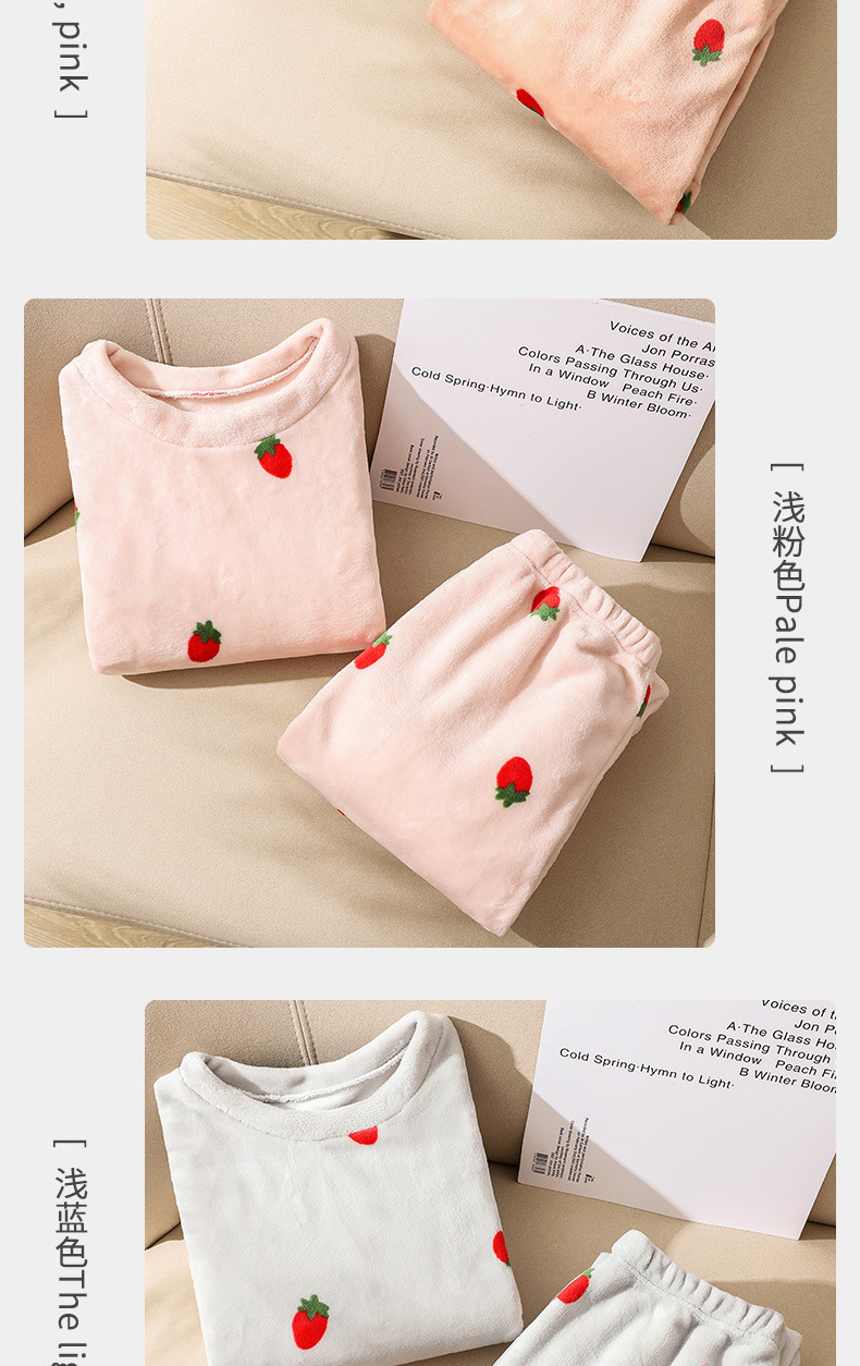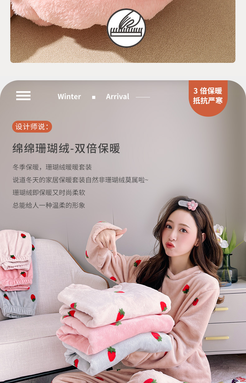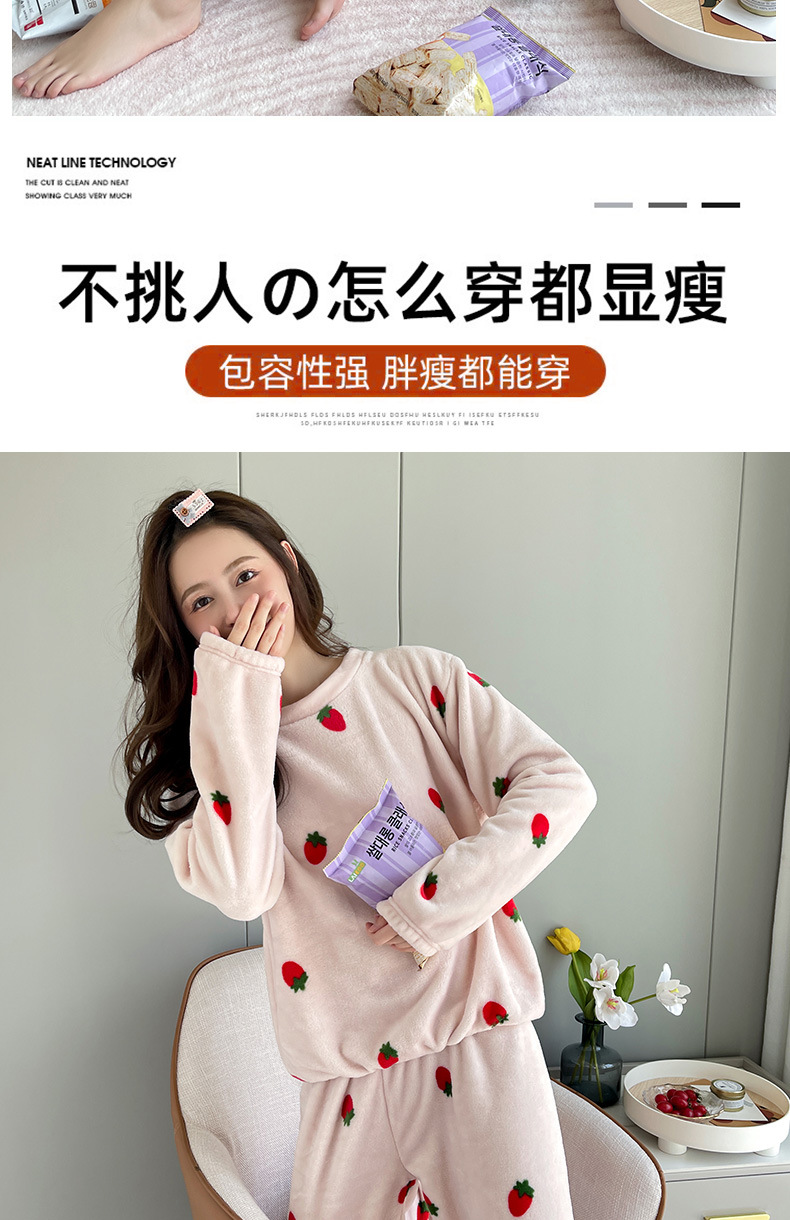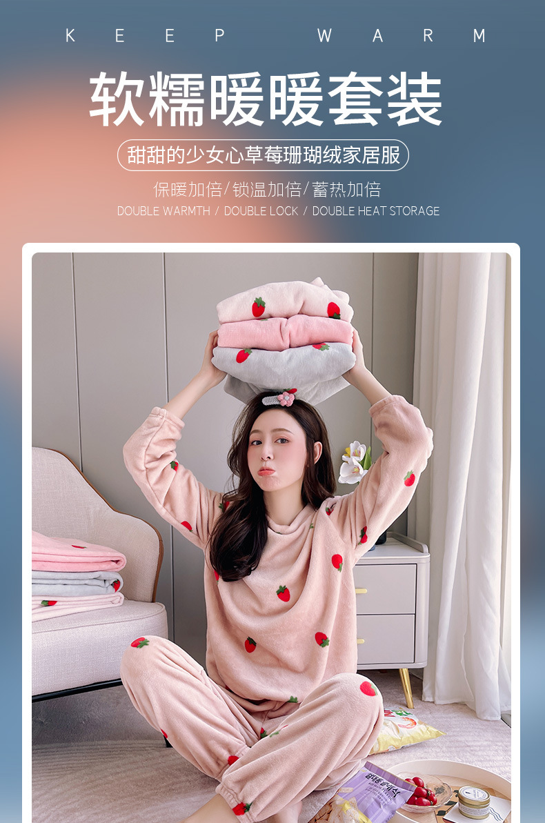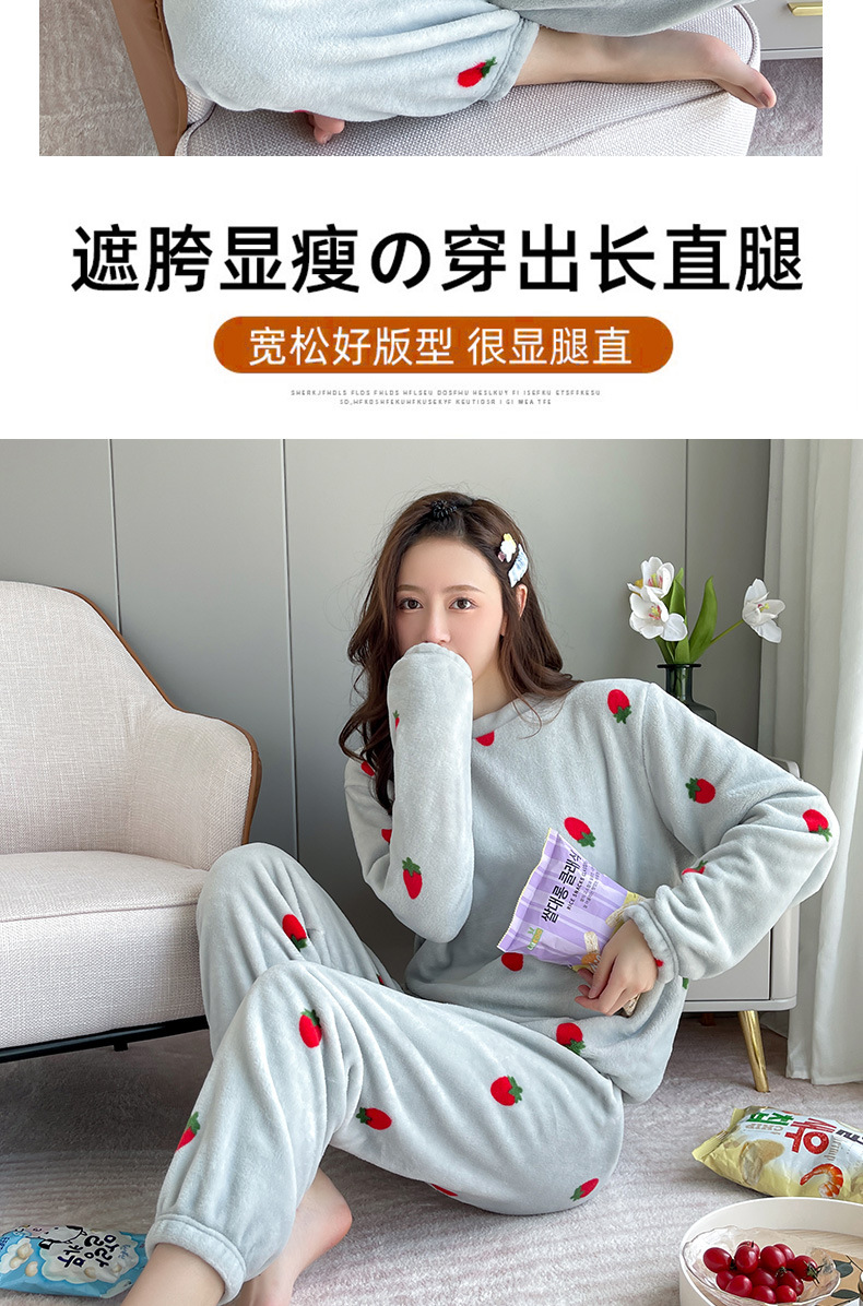 海谜璃珊瑚绒草莓暖暖套装睡衣女外穿少女秋冬保暖情侣家居服套装女HBF2827 灰色 均码