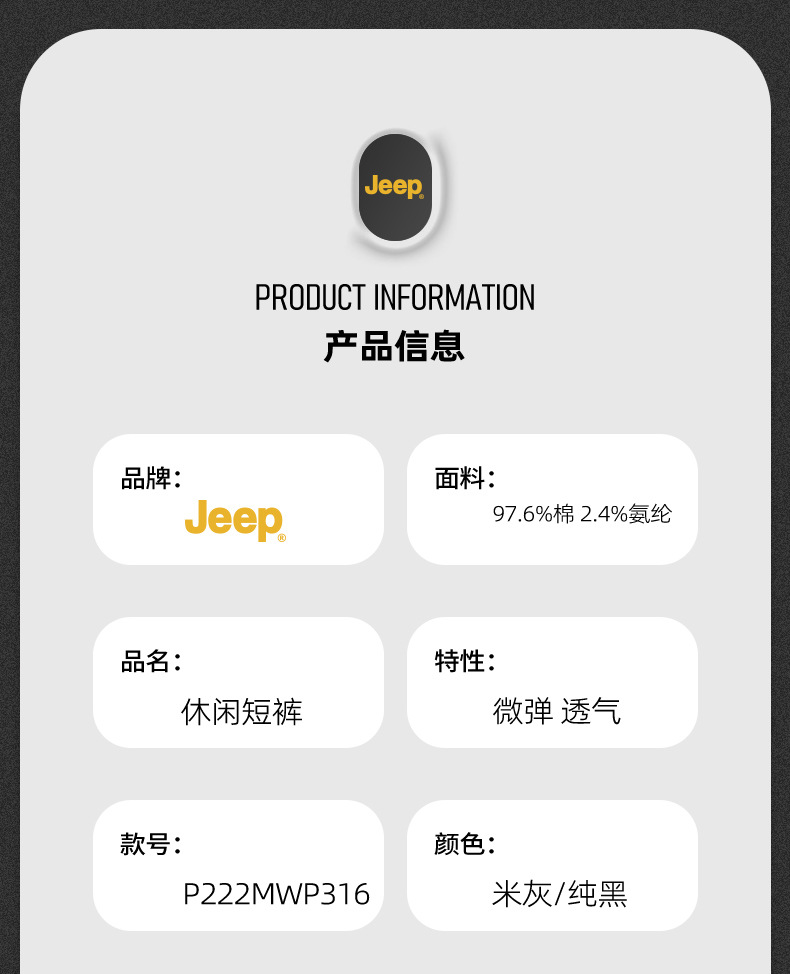 JEEP 新款夏季男士短裤透气舒适工装裤百搭纯色潮流微弹棉短裤男P222MWP316