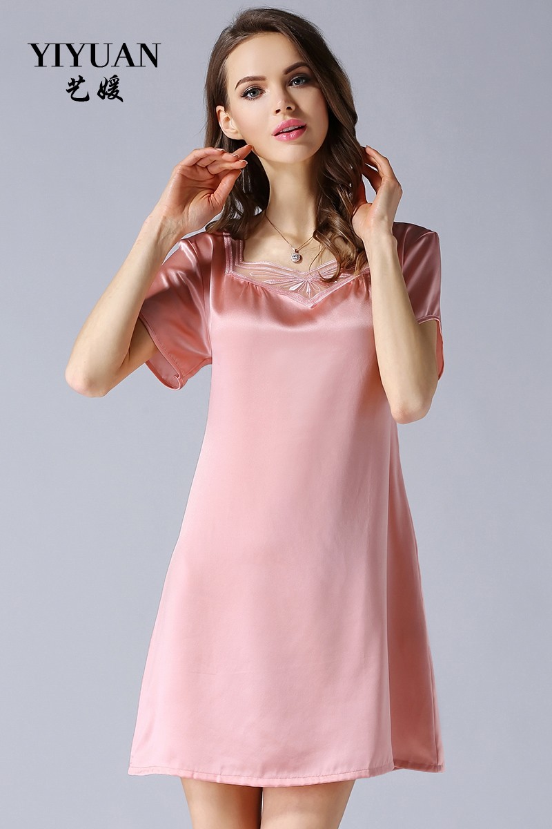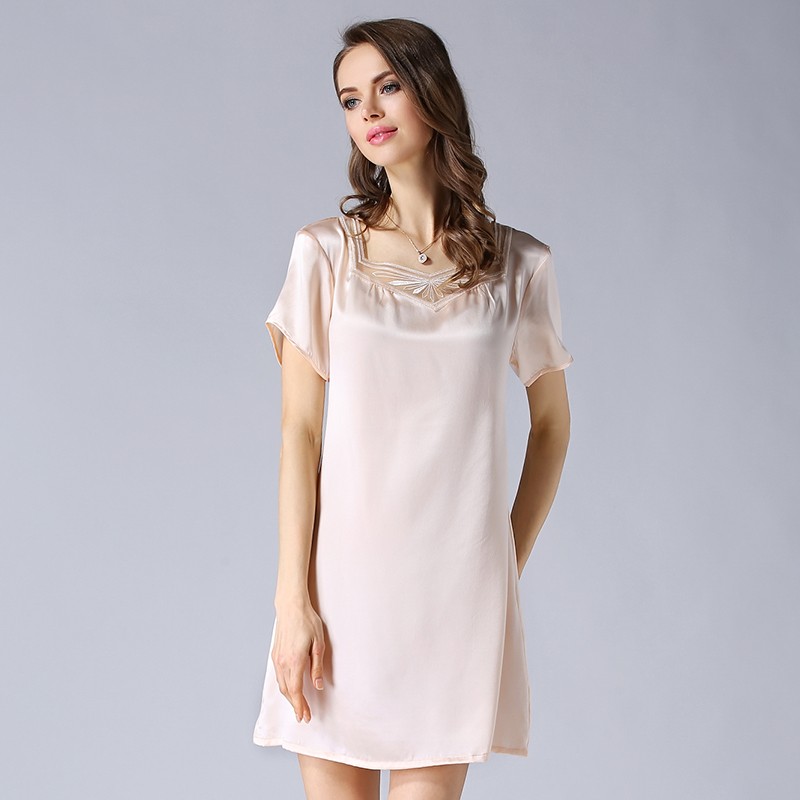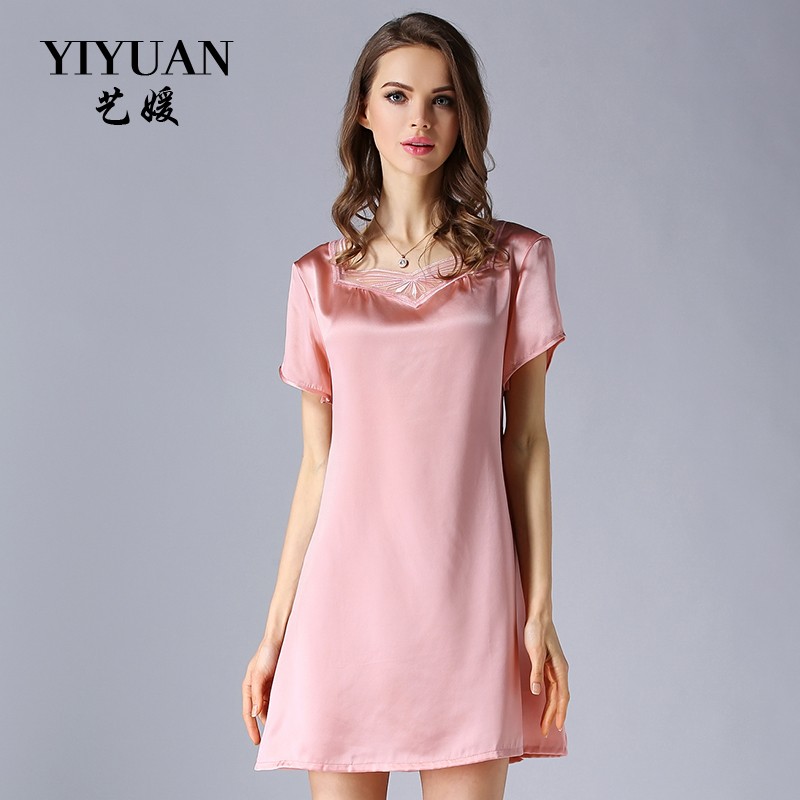 艺媛100%真丝睡裙女夏季短袖真丝睡衣性感桑蚕丝蕾丝丝绸家居服S55116