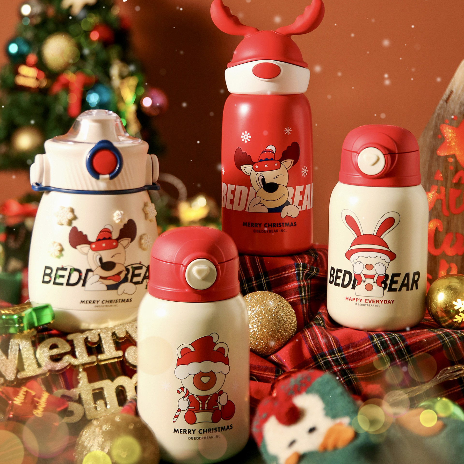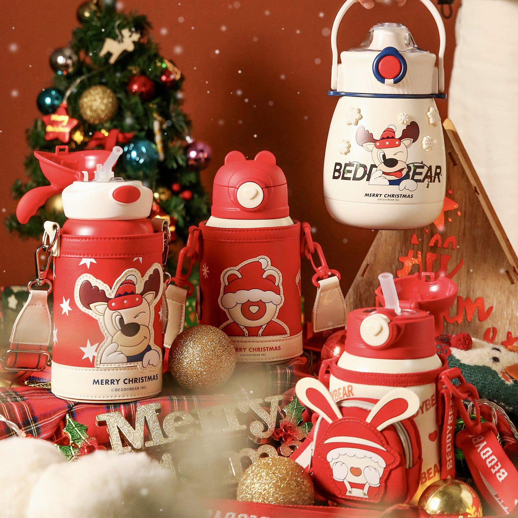 杯具熊圣诞儿童保温杯带吸管两用水杯男女小学生水壶礼物