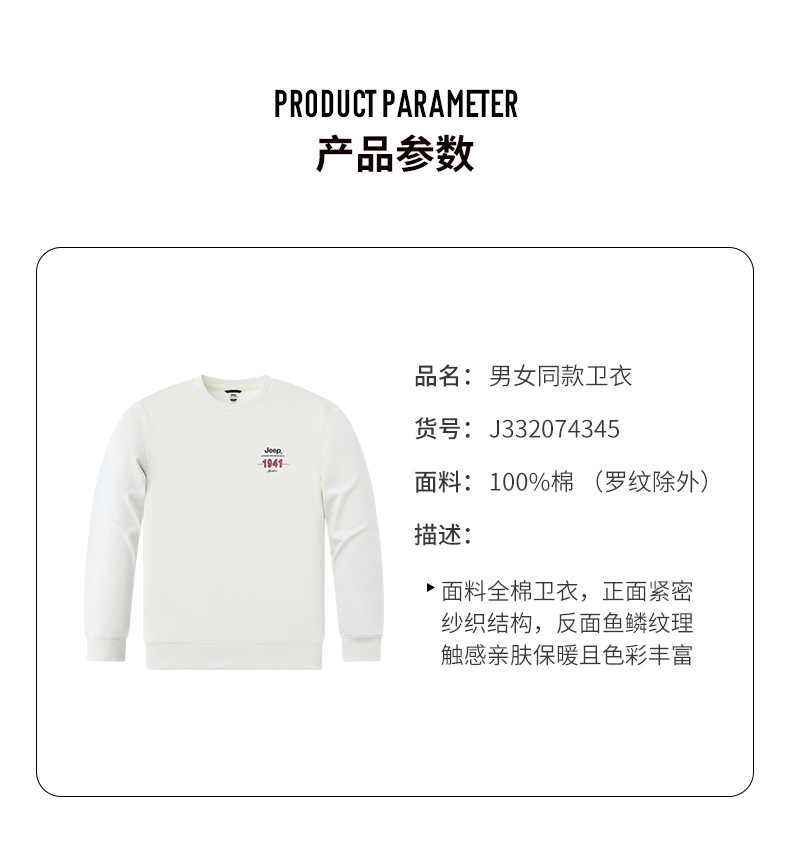 JEEP 秋冬季新款男式女同款休闲圆领卫衣舒适透气柔软亲肤保暖J332074345