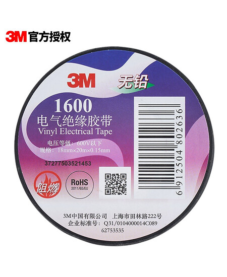 3M电工绝缘胶带汽修线束胶带家装无铅耐磨防潮 黑色 单个装 1600#