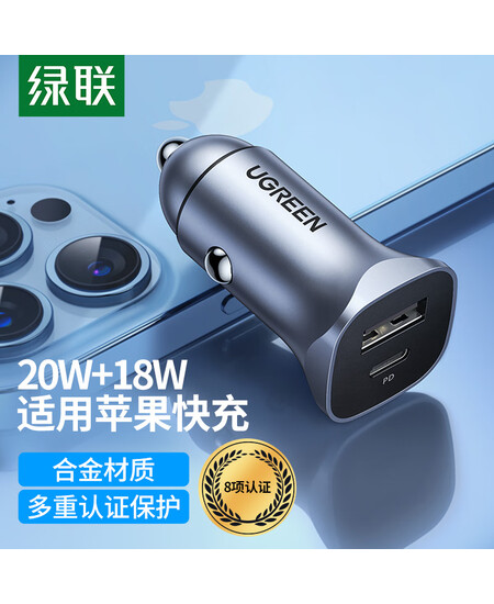 绿联车载充电器点烟器一拖二转换器插头快充 适用于苹果15/16华为小米