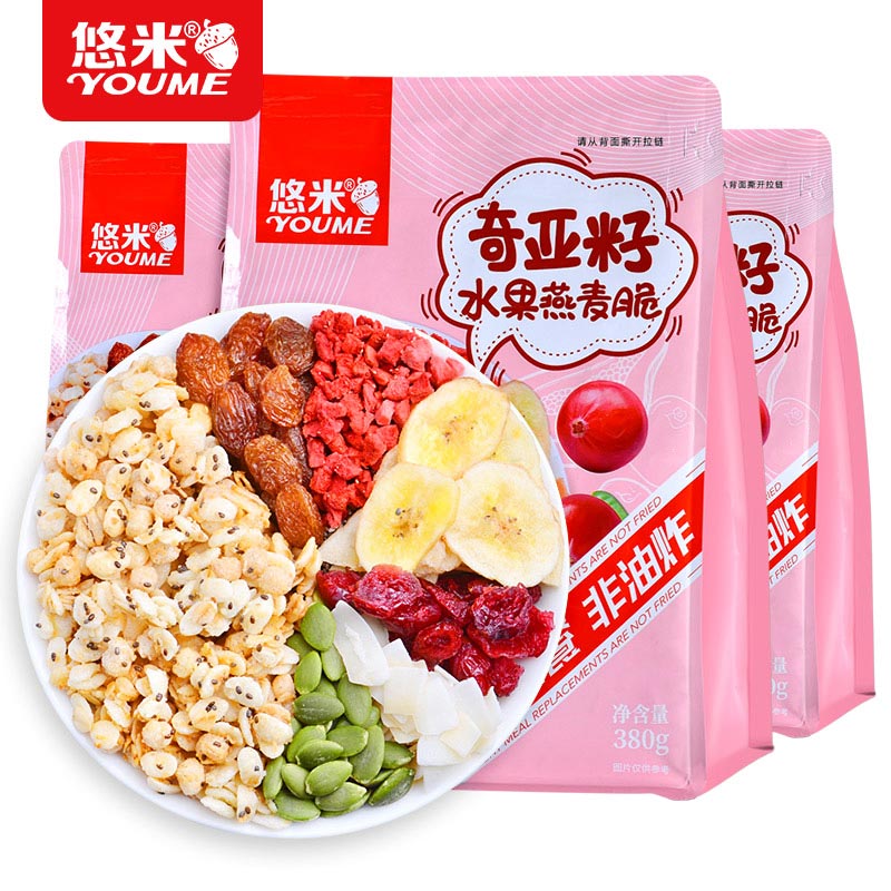 悠米即食燕麦片 代餐麦片营养早餐干吃零食奇亚籽水果燕麦脆380g*3包