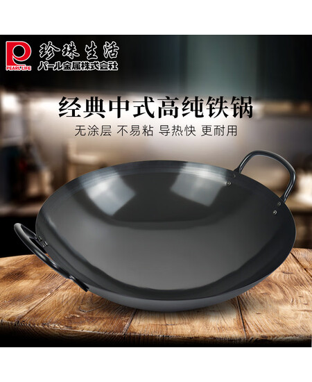 珍珠生活炒锅42cm日本进双耳铁锅无涂层熟铁加大炒菜锅H-8989