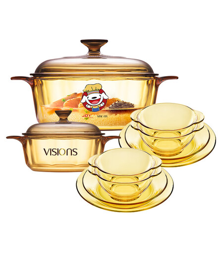 康宁(VISIONS)晶彩汤锅炖锅0.8L+2.25L+琥珀百丽餐具套装8件锅具套装家用