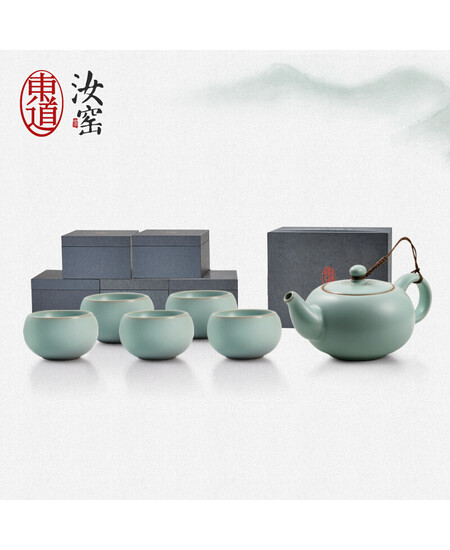 东道汝窑 陶瓷功夫茶具整套开片可养 福缘一壶五杯组2022款(天青)