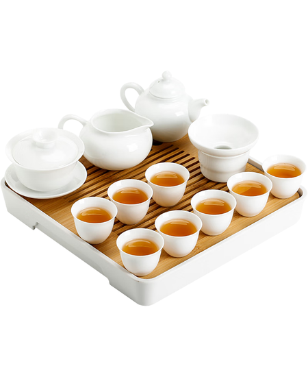 苏氏陶瓷(SUSHI CERAMICS) 功夫茶具套装简约白瓷茶杯带竹面储水式茶盘套组J0250