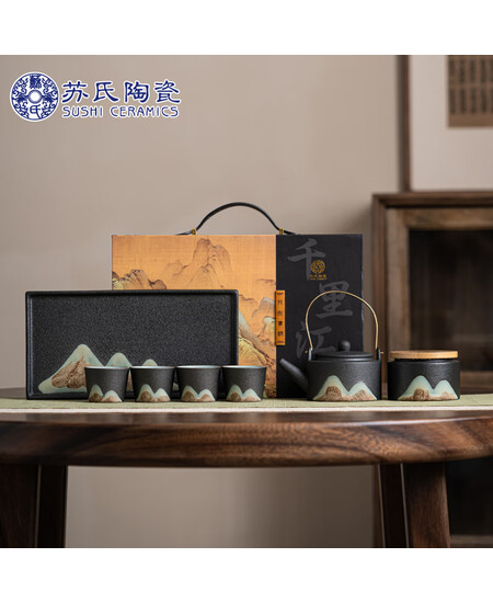 苏氏陶瓷(SUSHI CERAMICS)手绘彩画功夫茶具提梁茶壶配干泡茶盘茶罐7件套中秋礼盒J0182
