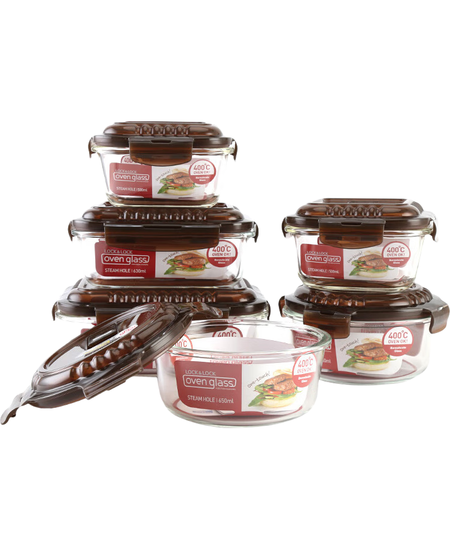乐扣乐扣耐热玻璃保鲜盒微波炉饭盒上班族学生便当盒带气孔餐盒六件套咖色