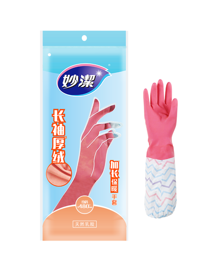 妙洁加长保暖乳胶手套 天然乳胶 1双 均码 长袖厚绒 家务厨房洗碗