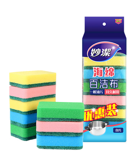 妙洁 海绵百洁布 洗碗棉 去油污抹布 厨房家用神器 四色分用 8片装