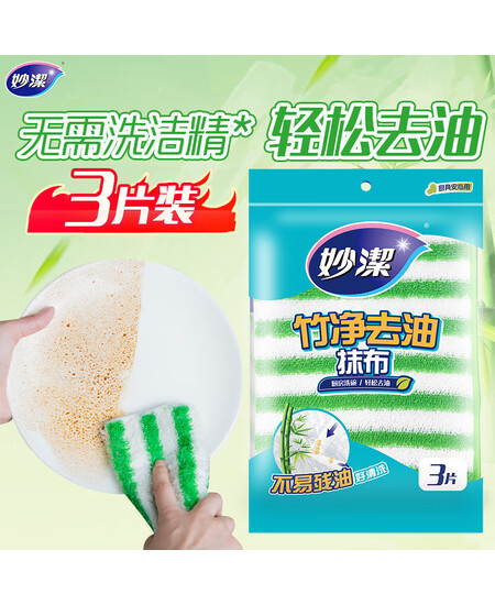 妙洁竹净去油污抹布23*18cm3片装 厨房洗碗布家用 独特纤维一冲即净