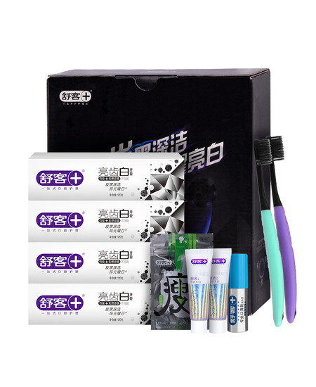 舒客竹炭天然珍珠超白牙膏120g*4+口喷牙线牙刷组合套装 美白牙齿 清新口气 呵护口腔(新老包装随机发货)