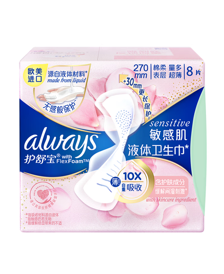 护舒宝敏感肌液体卫生巾量多日用270mm8片姨妈巾护肤款京东自营官方旗舰