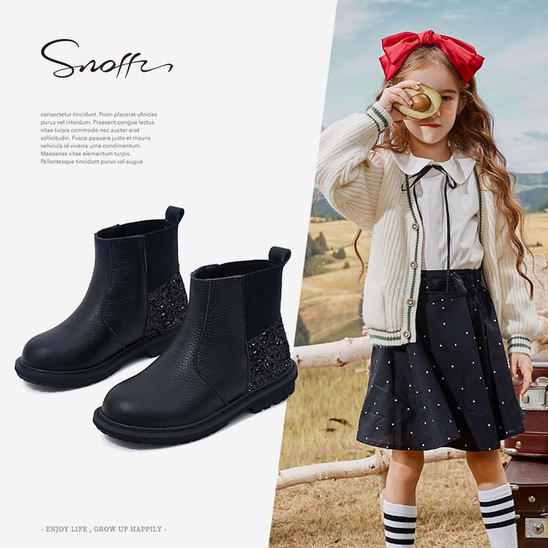 斯纳菲女童靴子秋冬季新款时尚英伦风小皮靴儿童黑色软底童靴209123