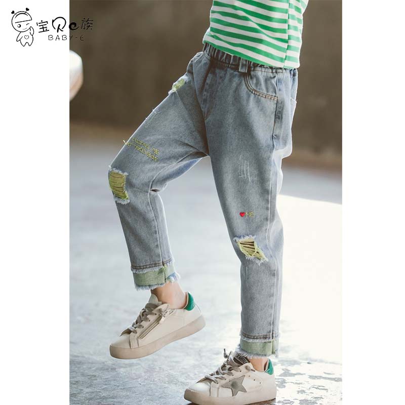 宝贝e族女童春秋宽松彩色破洞牛仔裤秋装韩版儿童 0107198577734