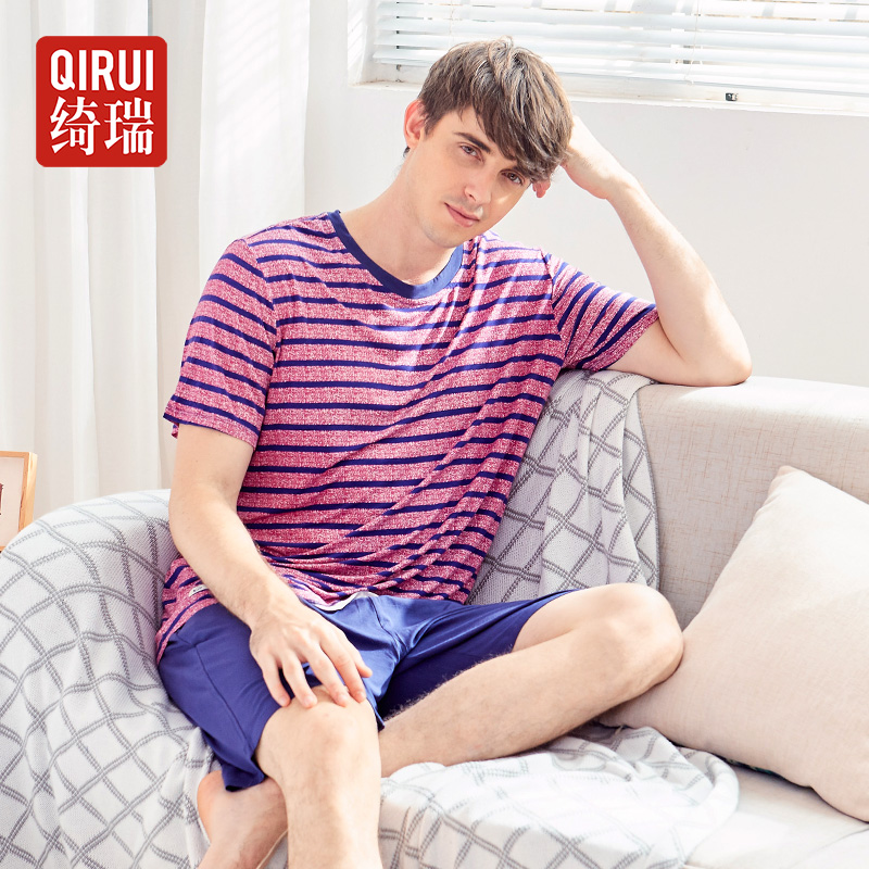 绮瑞夏季短袖睡衣男加大码莫代尔青年男士宽松条纹家居服休闲套装薄款QI55463