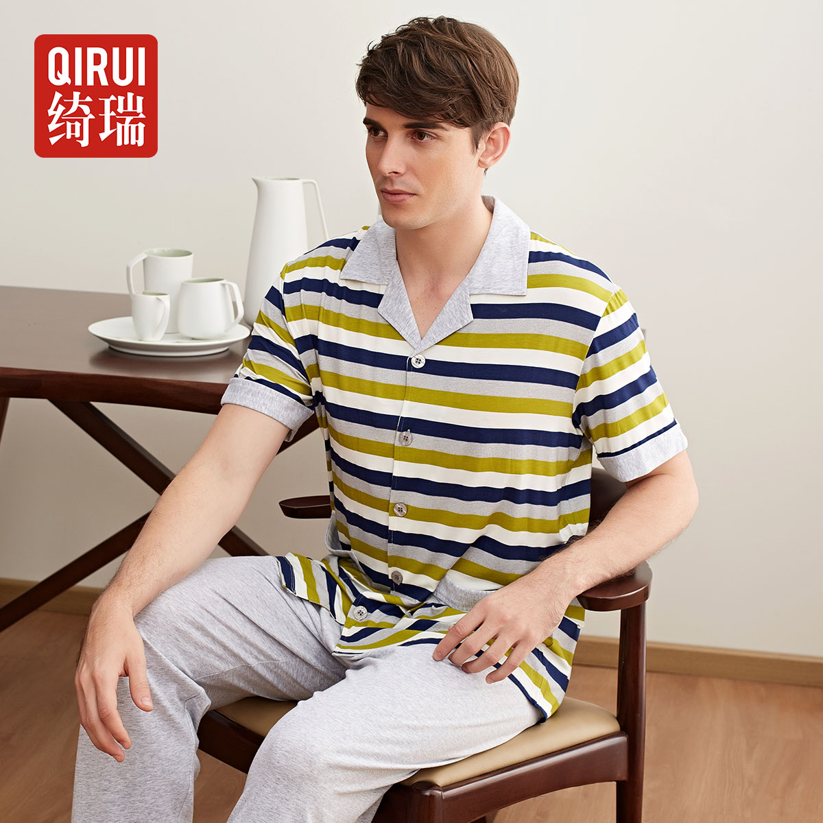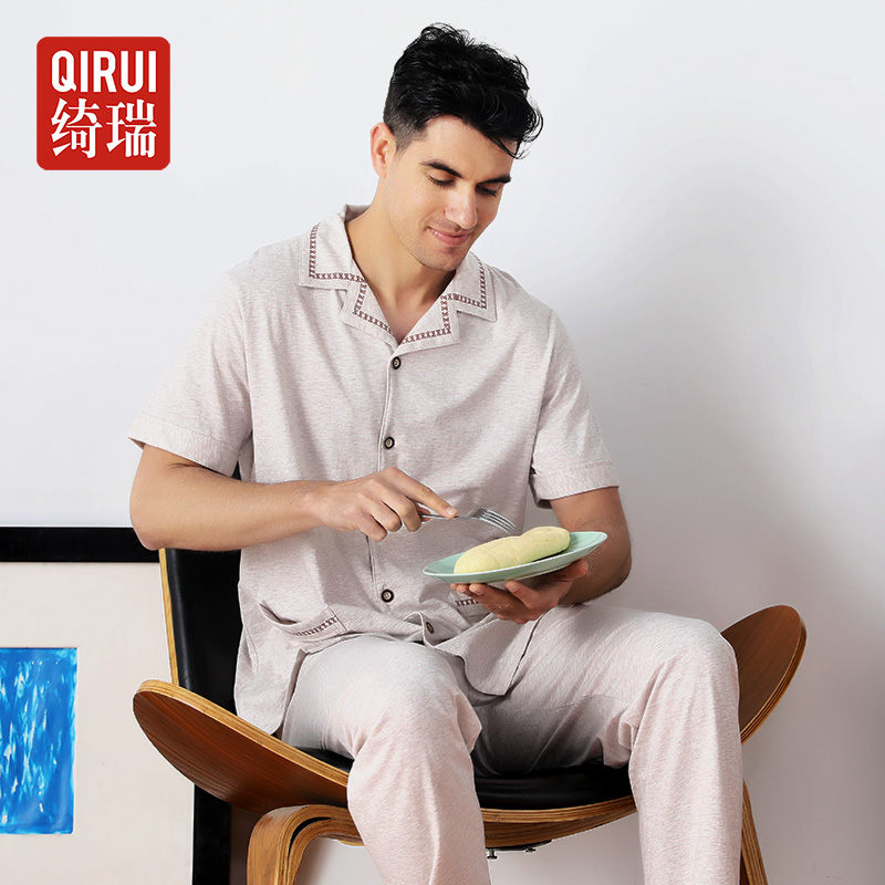 绮瑞男士全棉睡衣春夏短袖长裤加大码套装男夏纯棉薄款开衫家居服QJ53078