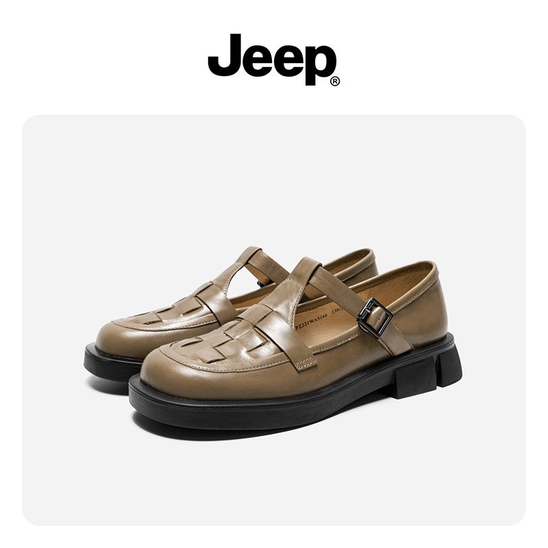 JEEP 新款圆头编织女鞋法式复古皮鞋风丁字单鞋PZ221WAS366