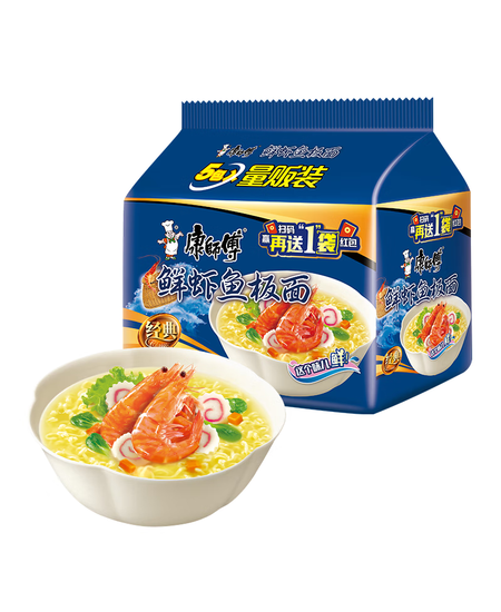 康师傅 方便面 经典鲜虾鱼板面五连包98g*5 泡面袋装速食 方便食品