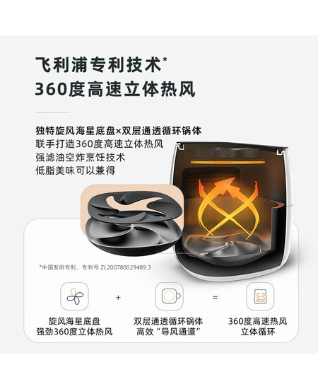 飞利浦(PHILIPS)空气炸锅 家用4L以上不用翻面 双层锅体易清洗 减少90%油脂 全自动7倍速热HD9741/11