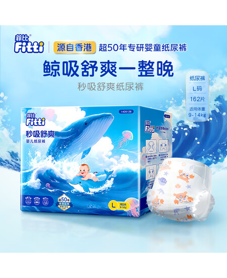 菲比Fitti秒吸舒爽纸尿裤L162片(9-14kg)尿不湿大码柔薄干爽