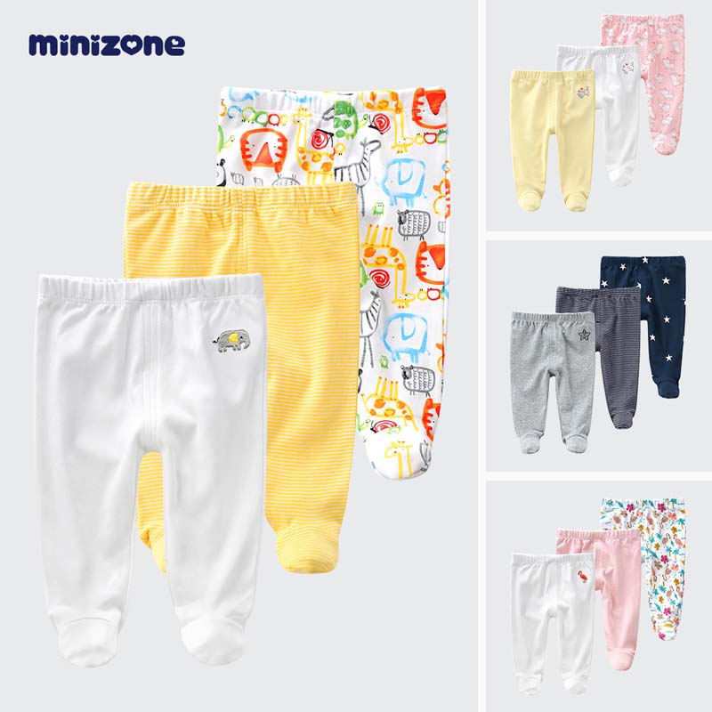 minizone新生儿裤子宝宝包脚裤春秋纯棉开档初生婴儿连脚裤三条装 J1018